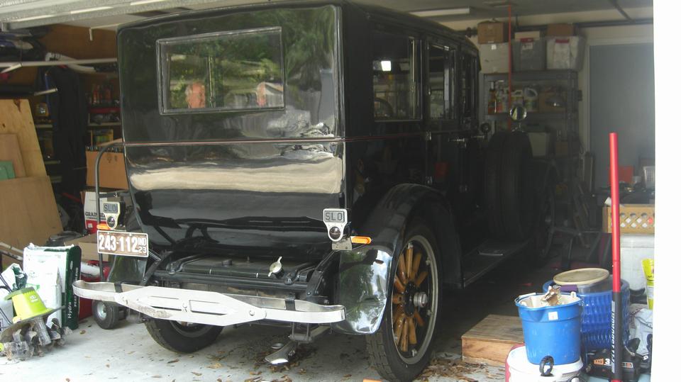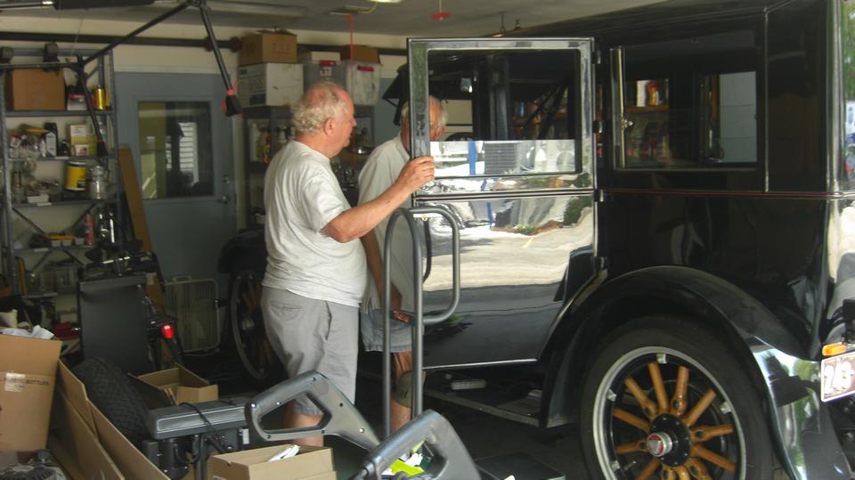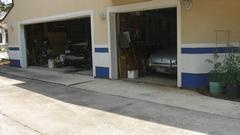 I finally dug up an earlier picture of Dean Duplantier (from Mandeville, La) who is the architect for the big garage,and owner of all the cars currently in that building. -- Then a short walk through the hedge next door to visit the original two car garage, which holds an Austin Healey 3000 and a 1926 Hudson. Huh? Oddly, these are the only two collector cars owned by Bob Hurst. Bob says the only reason he was building the big garage was to have a place to store and work on his Hudson. Gotta say that car is HUGE, the size of an opera sedan, like seven feet tall and long and heavy. The engine is something like 281 cubic inches displacement and makes all of 28 horsepower. That's Bob hiding behind the door in the center picture below, with Cliff Hughe holding the door.