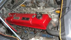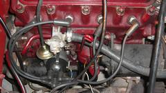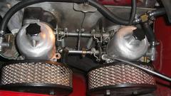 Crank, cough, sputter, no go. Good spark, so give it a sniff of ether and try again. Then it fired, ran like crap, very rich and smokey, and would die if it slowed down under 3000 rpm. At that speed no telling which carburetor was causing the problem, so disconnect the throttle link between the carbs, close the rear carb, increase idle speed on the front carb, give it another sniff of ether, and fire it up running on the front carb only. Still ran like crap, so the front carb was bad. Couldn't get to the linkages, so had to remove the air cleaners (PITA chore).