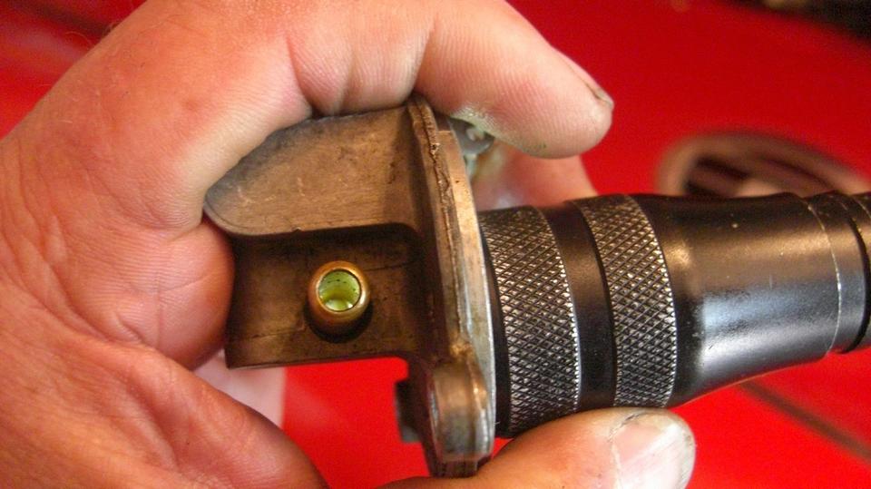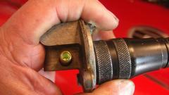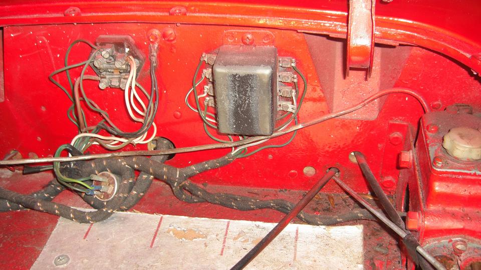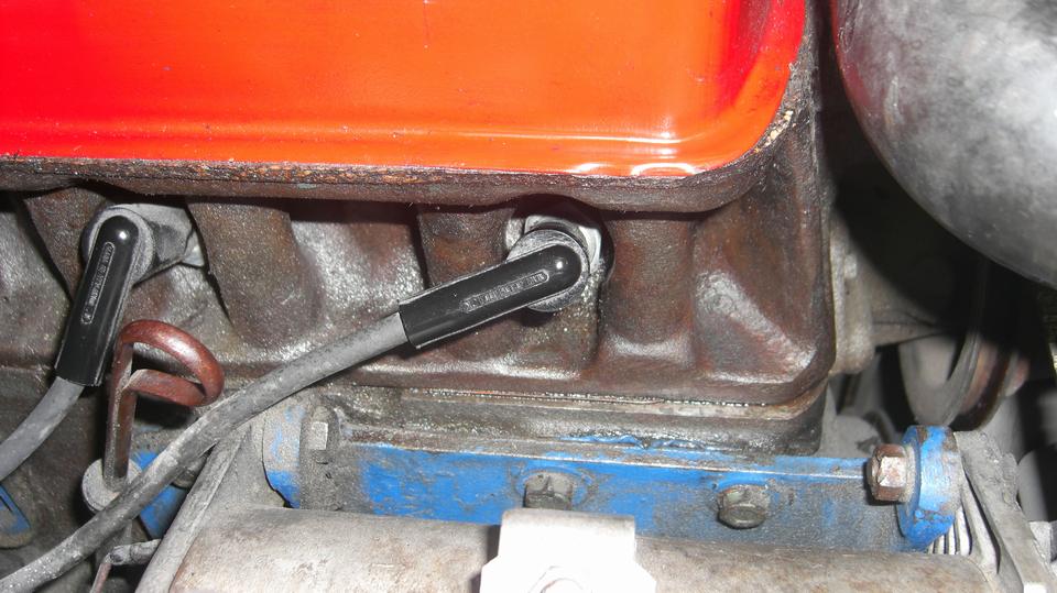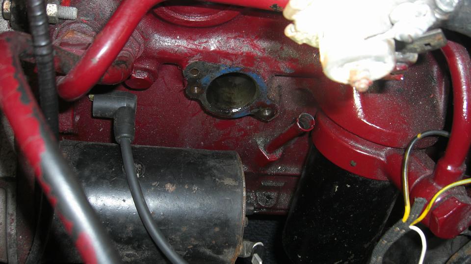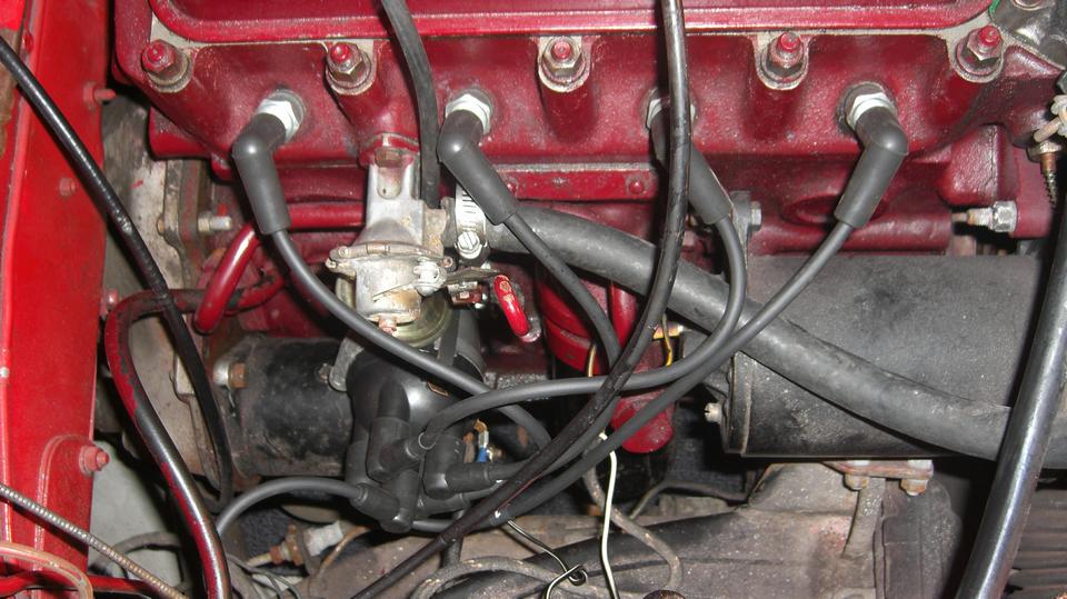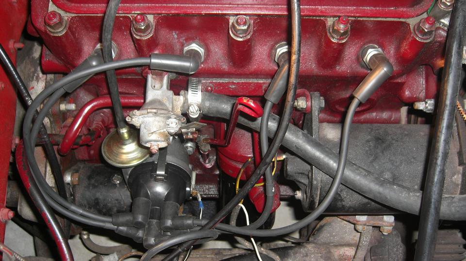 Smile and take a short break before going after the misaligned distributor. Standard fare here, remove the dizzy (loosen one clamp bolt and pull), then remove the base clamp (two bolts), and the diamond shape flanged casting (one screw). Use a rocker cover stud for a handle to screw into the distributor drive gear, pull it out, reorient it, and put it back in with the key slot below center and pointing toward the #1 spark plug ,and put it back together. Then we got to curse the person who drilled the distributor shaft wrong with the bottom drive dog disoriented about 30 degrees, not aligned with the top rotor. The dizzy body had to be rotated 30 degrees left, which made the vernier vacuum adjuster nut hit the starter motor. Rats!. Take it apart to turn the drive gear one tooth to the right, and put it back together again. Dizzy now in correct orientation with rotor pointing to #1 plug, and the spark wires now in the original positions, so it fired right up again just needing final spark timing. -- I just had to remind him that if he ever needed to replace the distributor, a different dizzy with correct configuration would not fit, because the drive gear is now one tooth away from correct orientation. That would force a correct distributor 40 degrees to the right (and would need to re-orient the drive gear again.
