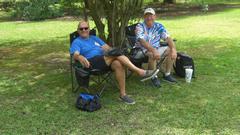 Mostly sunny, hot and humid today. Wandering up the path in the right direction, we ran across a couple of Brit club folks who found a spot in the shade. More pictures approaching the pavilion.
