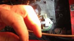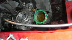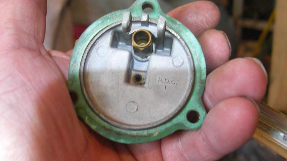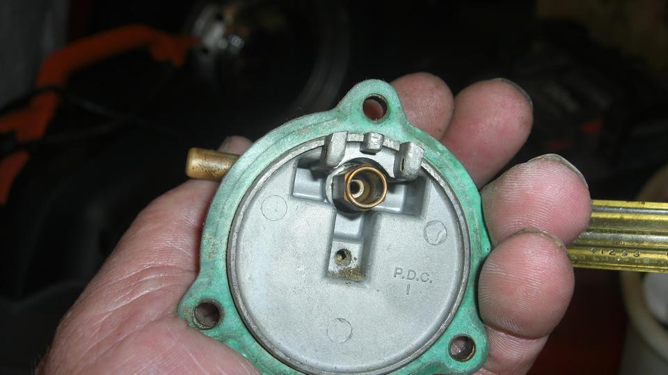 Adjusted the front carb full lean, and it still ran like crap. That much fuel had to be getting through the float chamber somehow, so time to remove the float cover. Fuel was a little low in the chamber, but the float was still floating. Some experience from the dark ages told me to check the vent port in the float cover, and sure enough the vent was clogged. The little vent hole in center of the cover has a tiny filter screen stuffed in it, and the screen was covered with debris. No-go trying to scratch the dirt off the cover, so we grabbed a tiny screwdriver to poke the screen, puncture it and just grind it out of there, and reassemble it.