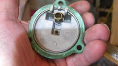 We also had the dashpot apart to check the fuel jet and metering needle number. The needle refused to let loose for removal, so forget that for now, leave the needle in there. The next demonstration was interesting to show what was failing. With the dashpot and needle removed, and the float cover screwed down tight and sealed, put a finger over the vent port to close it same as the clogged vent screen, and switch on ignition (and the fuel pump). The resulting geyser from the main fuel jet nearly hit the bonnet, causing Rick to back up a step. With the vent closed, fuel would rise a bit in the float chamber, but not enough for the float to cut off fuel flow. Resulting air pressure in the float chamber would blow fuel right through the jet past the needle, flooding the carburetor.