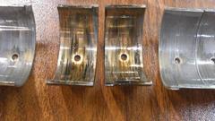 Rumble over to Cliff Hughes place in Mandeville, LA to borrow his air conditioned garage space. Pick up the new parts order and verify it is all there, then get after jacking up the car to R&R the oil pan to change the con-rod bearings. Drain the oil first, of course. Lots of fun lying on my back unscrewing oil pan bolts, especially the ones up front hiding above the suspension cross member. When the pump was removed, everything would drip incessantly with oil in my face. Been there before, just grab some rags and keep going. Not long to uncover the low oil pressure problem(s). I suppose all of the rod bearings were scuffed a little. But #2 was scuffed quite a lot. Most all of the white metal was erased on #2, but the underlying copper layer was still there, not through to the base metal, so it hadn't damaged the crankshaft journal. Too close for comfort, but I'll settle for lucky any day.