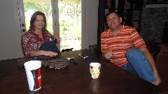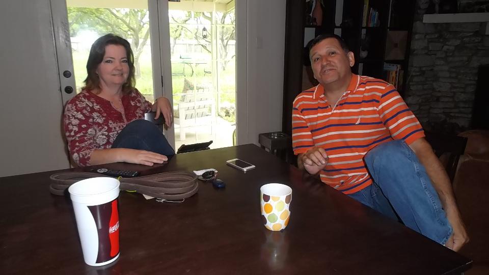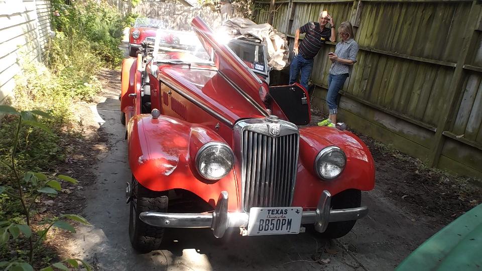 Then we were sitting on WiFi for a while, considering heading south. We had a call down to Sam Stanton in Brownsville, TX, inquiring about South Texas British Car Club. Sam called a friend, and very shortly we had a call from a fellow who was supposed to be in Harlingen (near Brownsville) but just happened to be in San Marcos tonight (near San Antonio). So we hit the expressway and drove an hour west in a rush, arriving about 10-pm, to say hello to Javier (Harvey) and Mary Bazan.