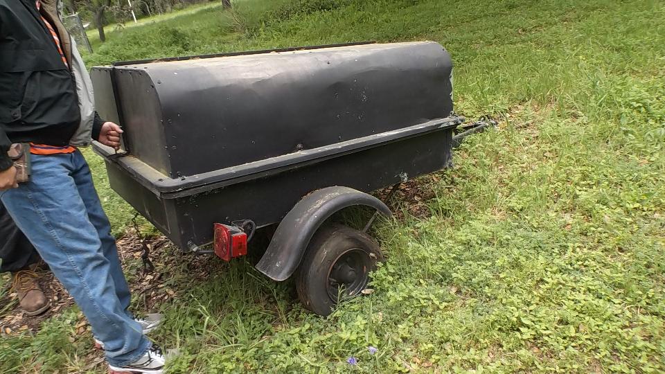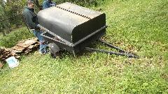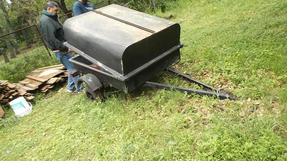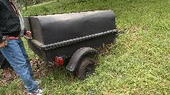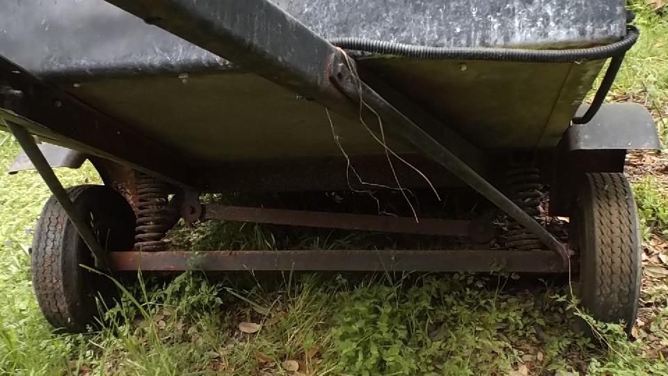 In the morning as we were getting ready to depart from Harvey and Mary's place, a roving landscaper noticed the MGA with trailer in the driveway, then stopped to point out another little trailer sitting far back in the grass across the street. This was a light weight (relatively speaking) all steel trailer, perhaps old but durable. It has trailing arms, coil springs, shock absorbers and a panhard rod (somewhat more sophisticated than my little leaf spring trailer). In a few minutes Harvey had a deal to buy it (cheap), and took it home immediately.