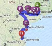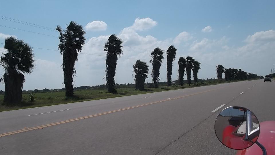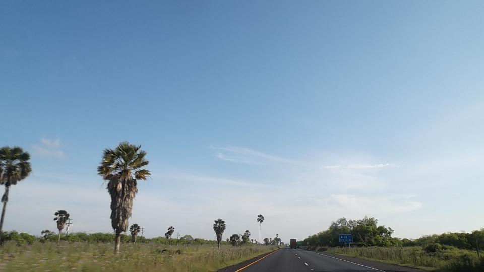 Today we caught the free ferry from Aransas Pass to Port Aransas, TX, all of 0.2 miles. The ferry boats are four lanes wide and several cars long. There are six ferry docks each side, and the boats are very busy. They should build a bridge here. Continuing south on Mustang Island Road (bird watchers paradise) we finally turned up through Flour Bluff into Corpus Christi. After a brief rest stop we were heading south again on US-77, making a fuel stop in Raymondville. From this perspective it is beginning to look a lot like Florida, flat with palms.