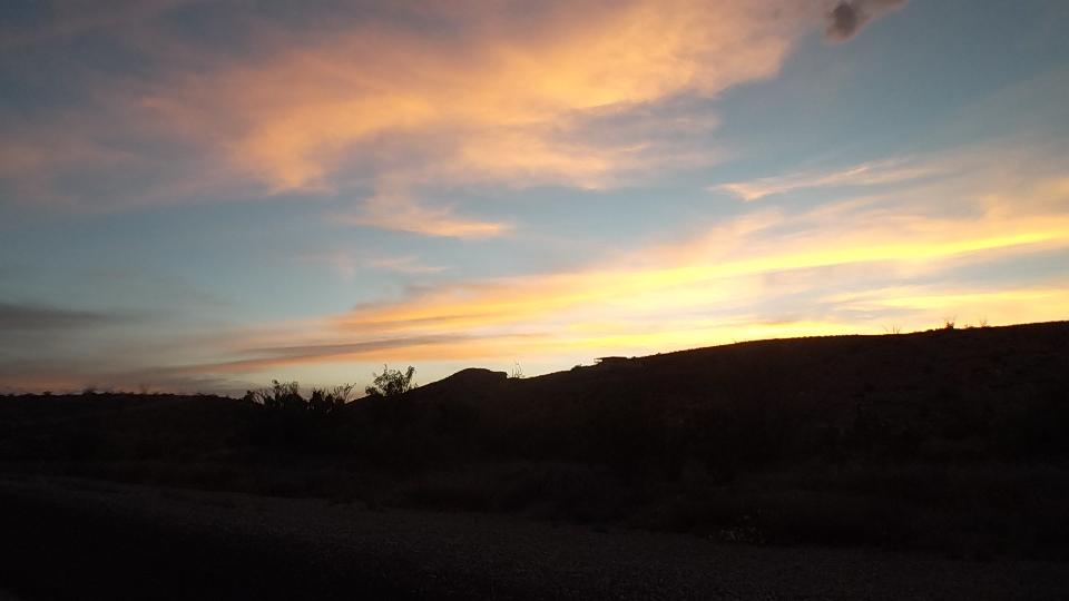 At the southwest corner of Big Bend loop we turned west on TX-170, destination Presidio, 66 miles The real point of this was to continue following the border as near as possible. This turned out to be another delightful road but for a different reason. Think nice blacktop, lots of twists and turns, 40 mph average speed, lots of hills (some up to 15% grade). Nice sunset, and with diminishing light more challenging driving. We found hilltops with very short visibility combined with switchbacks that tend to change direction unpredictably at tops of hills. Lanes were well marked with reflectors, easy to see in the dark. Going downhill toward face of a mountain the road would appear to disappear into a dark tunnel, only to turn away just before some possible impact. This was jolly good fun as I was busy driving and navigator was busy putting nail prints in the dash and creases in the seat cushion, and neither us us was taking pictures (not that pictures in the dark would turn out anyway).
