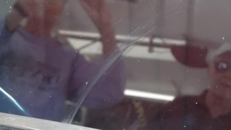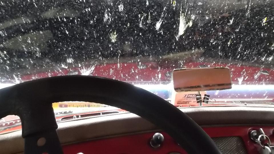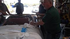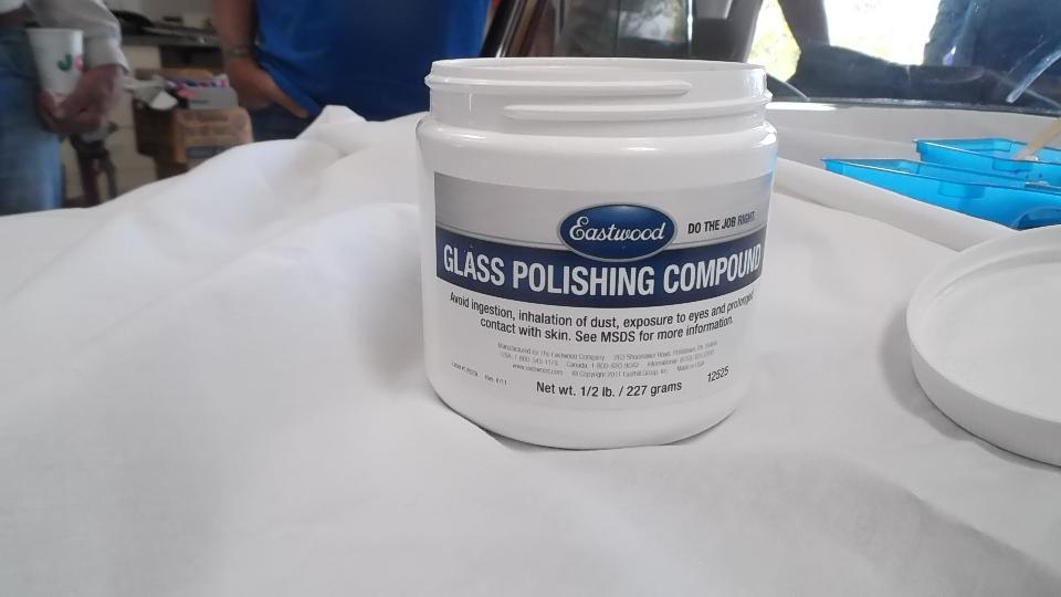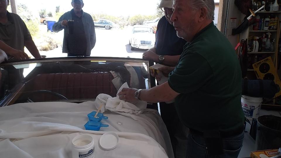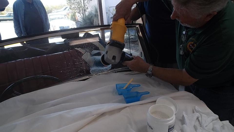 First project for the day was to be buffing a nasty scratch out of the windscreen glass on a Morgan. I seem to have made a bit of an ass out of myself interfering while getting these pictures. The idea is to mix cerium oxide powder with a bit of water to make a paste, then use it to buff slowly with a power buffer until the glass comes out clear. Bottom line is, it seems to work.