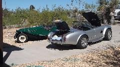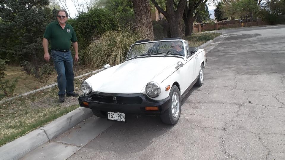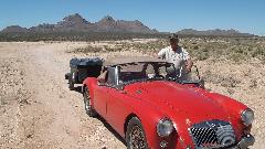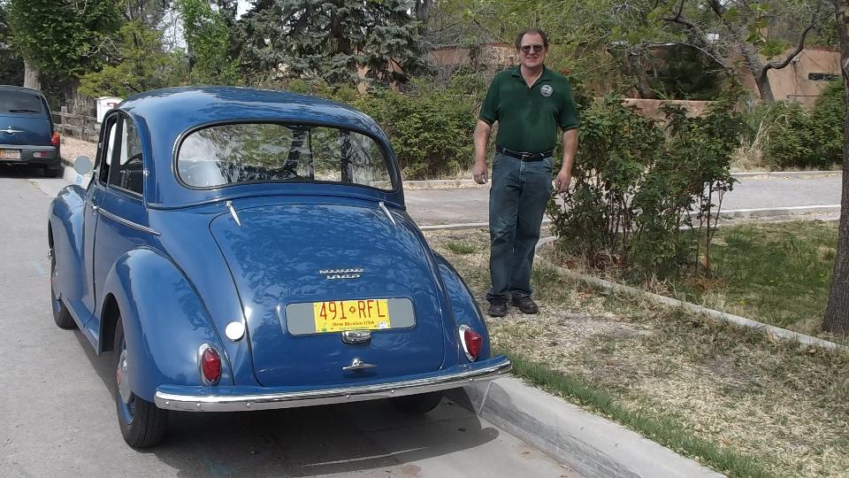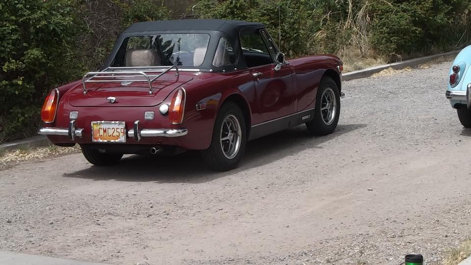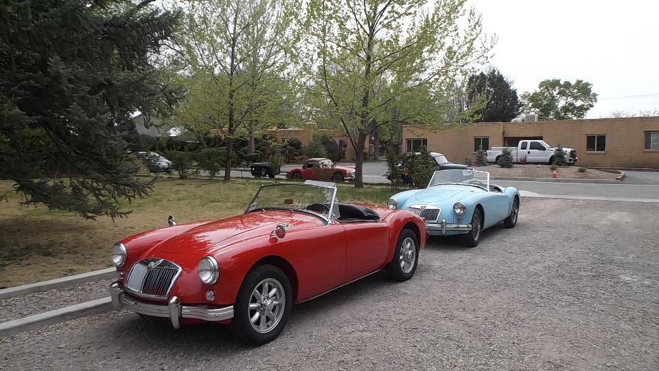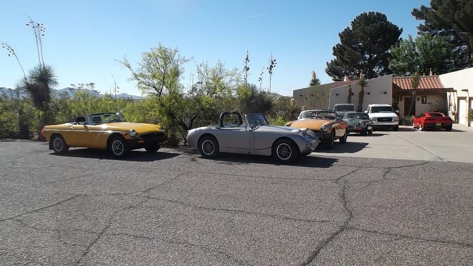 Somewhere between late night and early morning we had a 3-1/2 hour run up I-25/US-85 from Las Crusas to Albuquerque, NM. We missed yesterday's cub meeting with British Automobile Owners Association, but today there was an impromptu meeting of club members at the home of Kevin Kittle, the club's newsletter editor. The cars came trickling in one, but soon there were many (at least several). The blue car is a Morris 1000 that has been converted to electric, quiet as a mouse when it runs off. Seems like there were as many Midget as MGA (or should that be the other way around)? The Rover and Mini live here.
