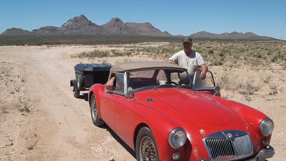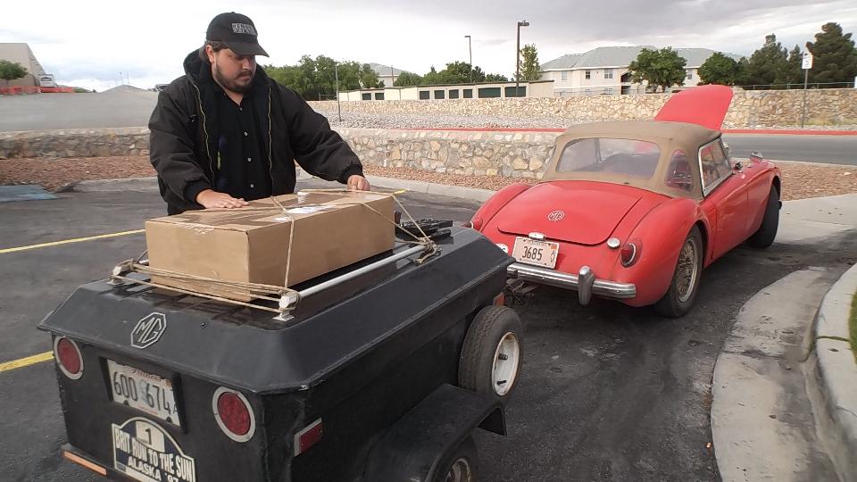 Our primary task today was to amble on back to El Paso to retrieve the packages the had arrived for us at the home of a friend. The smaller but heavier package contained two front wheel bearing hubs, quickly tucked inside the trailer. The larger package was the long awaited delivery from Moss Motors containing all sorts of booty, which had to be tied momentarily on top of the trailer for short transport.