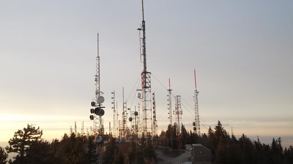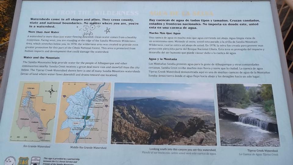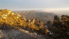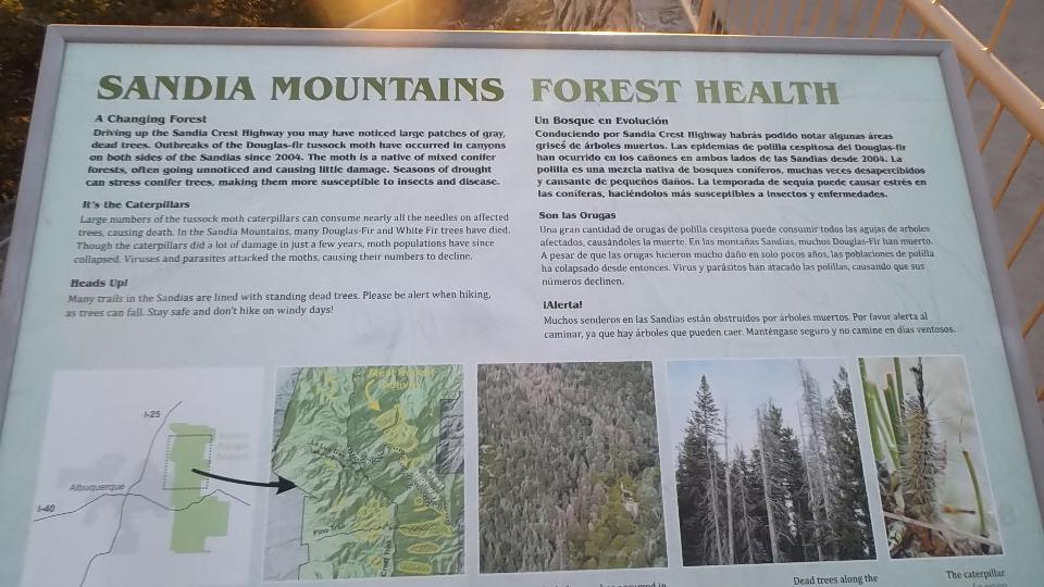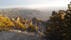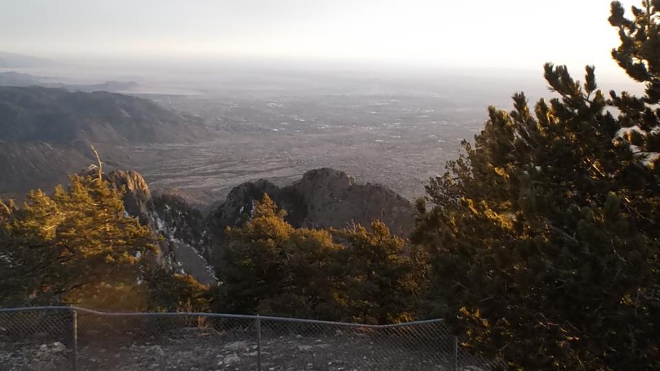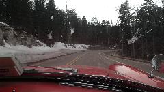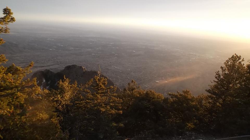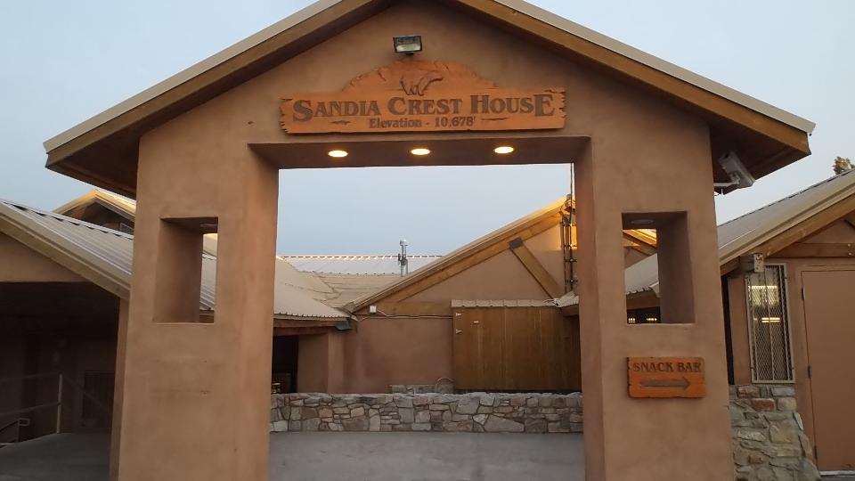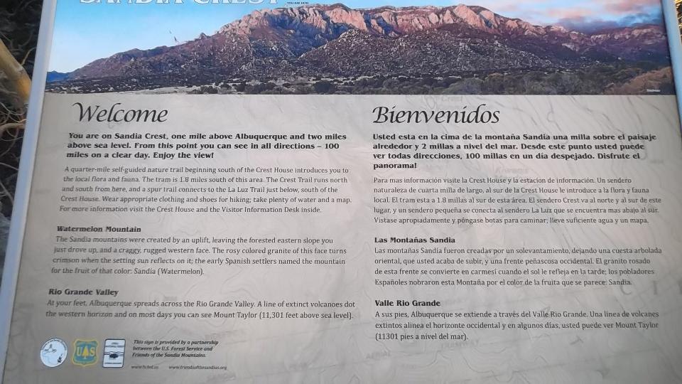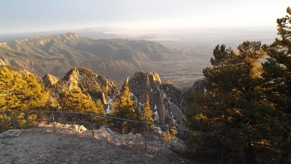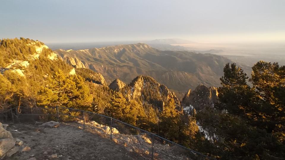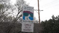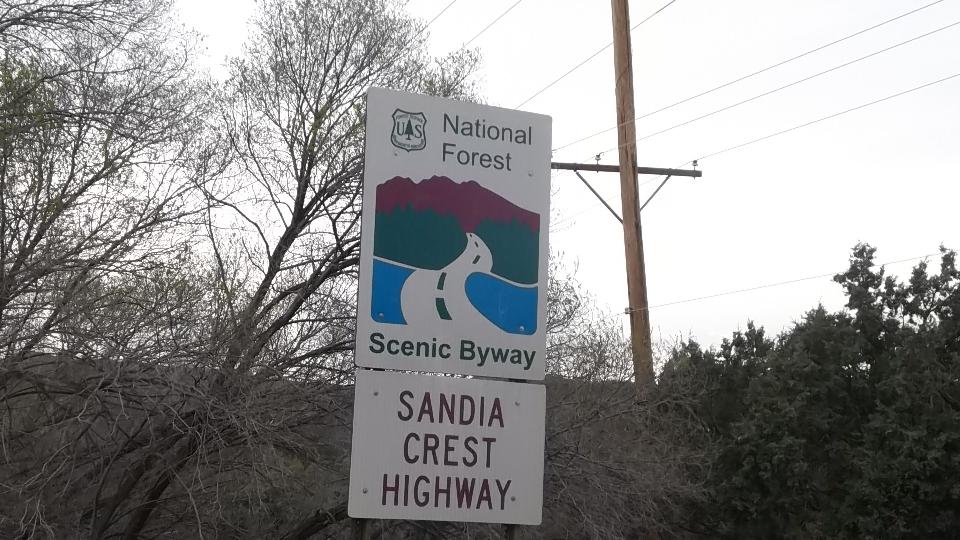 This started with an up hill run 15 miles east on I-40 (70-mph) followed by a few miles north on NM-14 (more up hill at 50 mph). Then we turned west (sort of) on NM-57, better known as Sandia Park Scenic Byway (or Sandia Crest Road). This was just 14 miles of asphalt, but it took about 25 minutes to climb a very serious hill with tighter and tighter switch backs. Starting a mile above sea level with 80dF temperature in Albuquerque, we were now two miles high with more like 50dF and plenty of snow that had not yet melted (just in time for sunset).