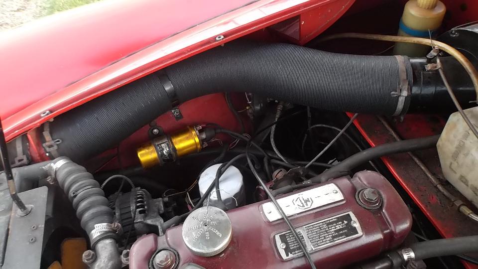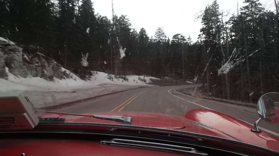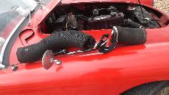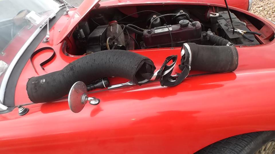 At first opportunity we stopped to unpack the larger box, and install the new 4-inch air trunking tube in the MGA. This was somewhat overdue, replacing a 28 year old part I had damaged several years earlier. This should keep some engine bay hot air out of the vent in warm weather. You may notice the navigator was happy to help with this little project. When finished, the rest of the smaller parts were stashed, mostly in the trailer, a few in the boot, and the large box with packing materials was unceremoniously disposed of.