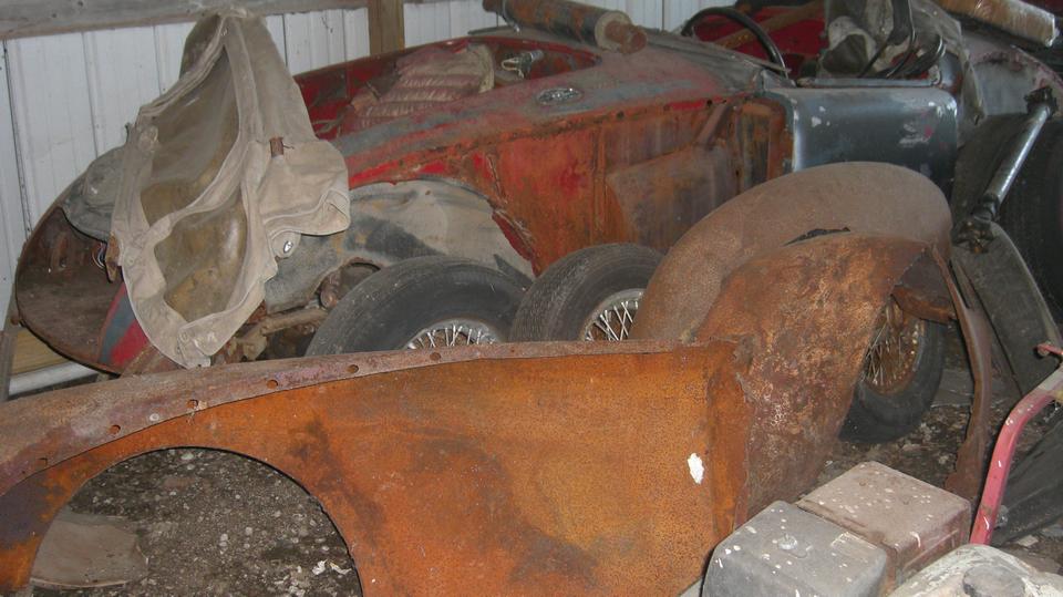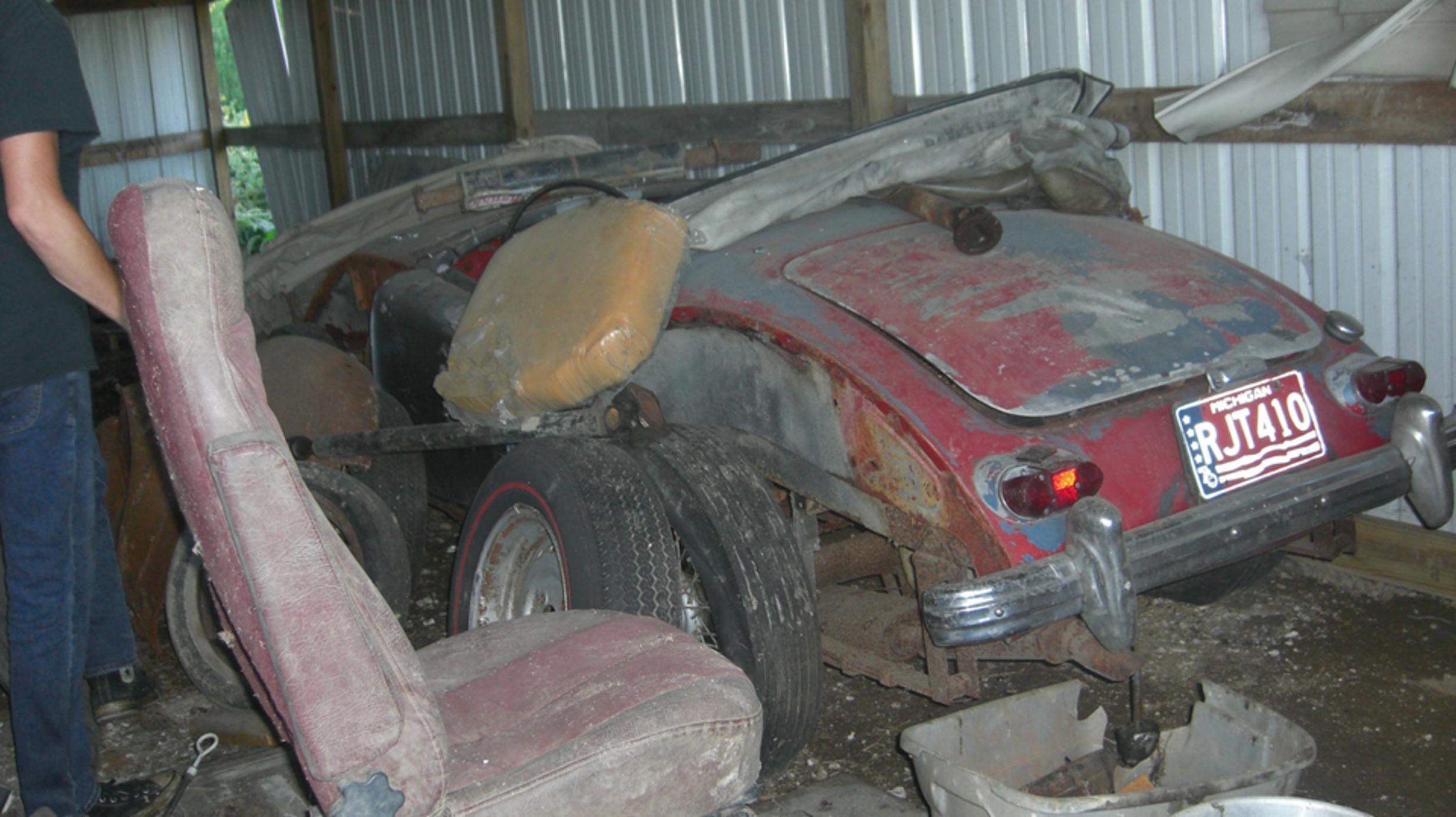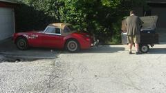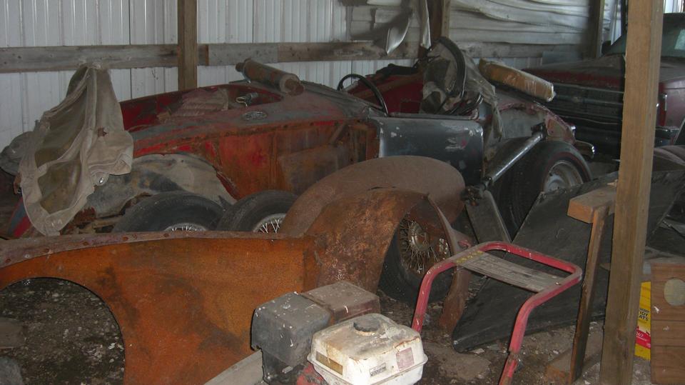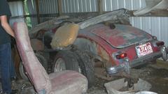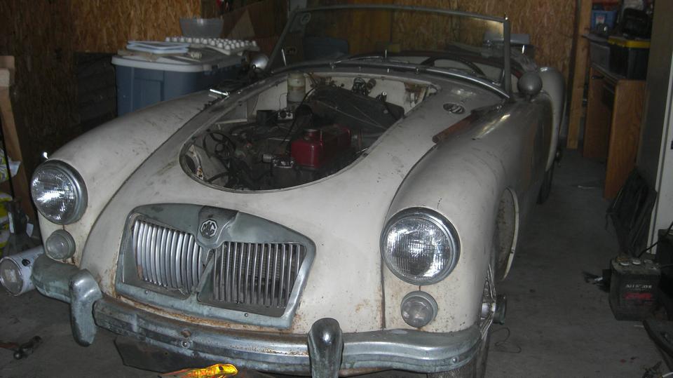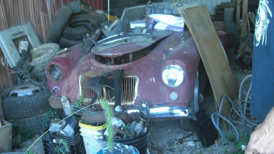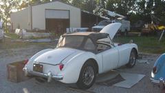 Then we were off to "the farm", Shane's father's place outside of town, to check out the collection of MGA. Let's see if we can count to six here. First Shane's blue car that brought us here. Then the white one just acquired, which had a dead battery because it wasn't charging. Not enough juice to turn it over, so we hooked up jumper cables and set the blue one to idle at 1500 rpm for charging.