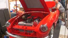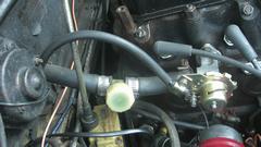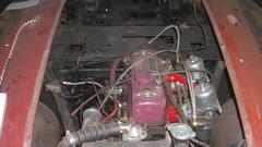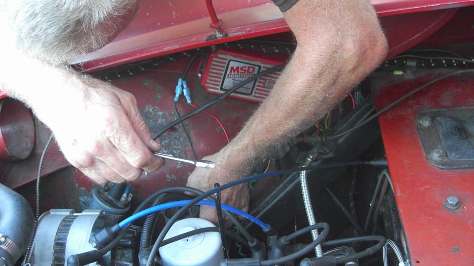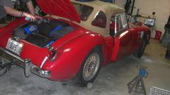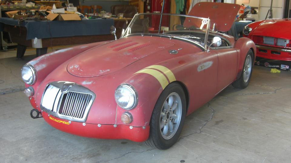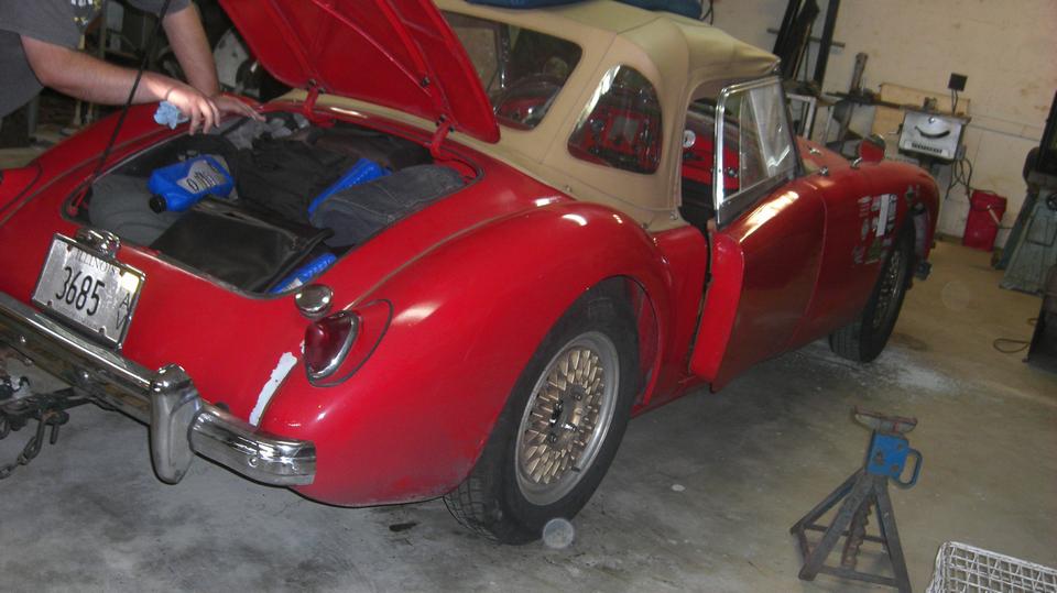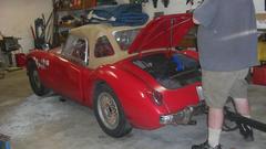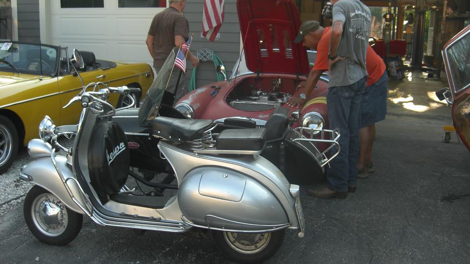 Turns out the Vespa with sidecar is a local resident, one of Tommy's toys. The dusty red MGA wannabe race car has been suffering ignition problems, drives okay sometimes, then doesn't want to start the next time. Swapping out the distributor didn't help. The MSD high energy ignition module on the inner fender is highly suspect.