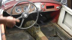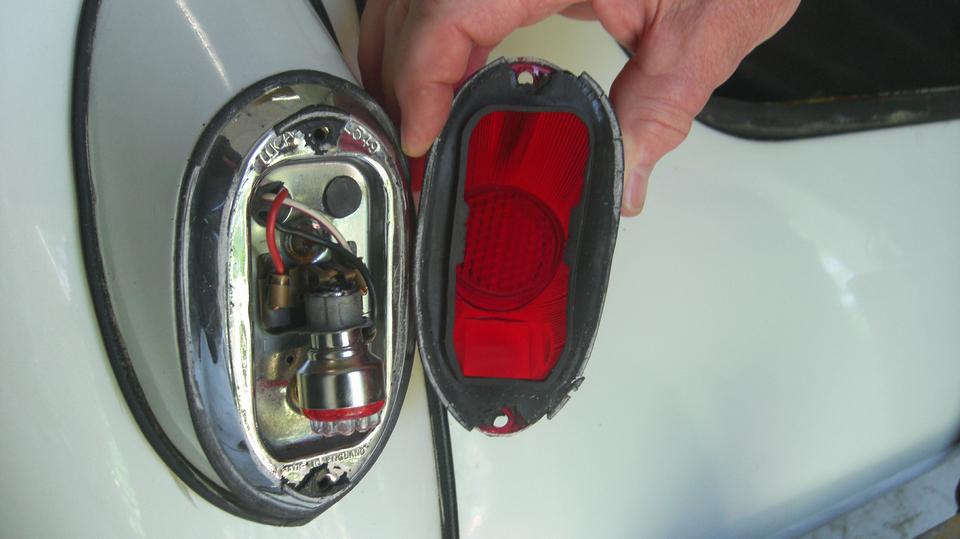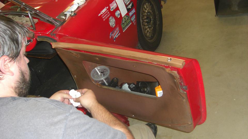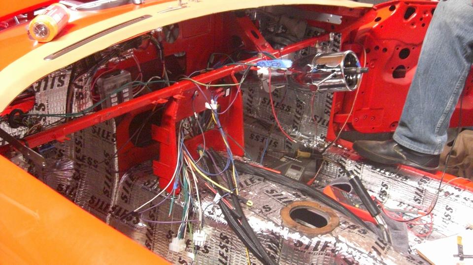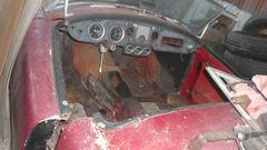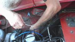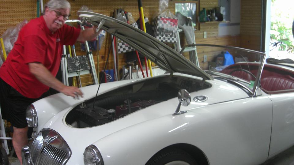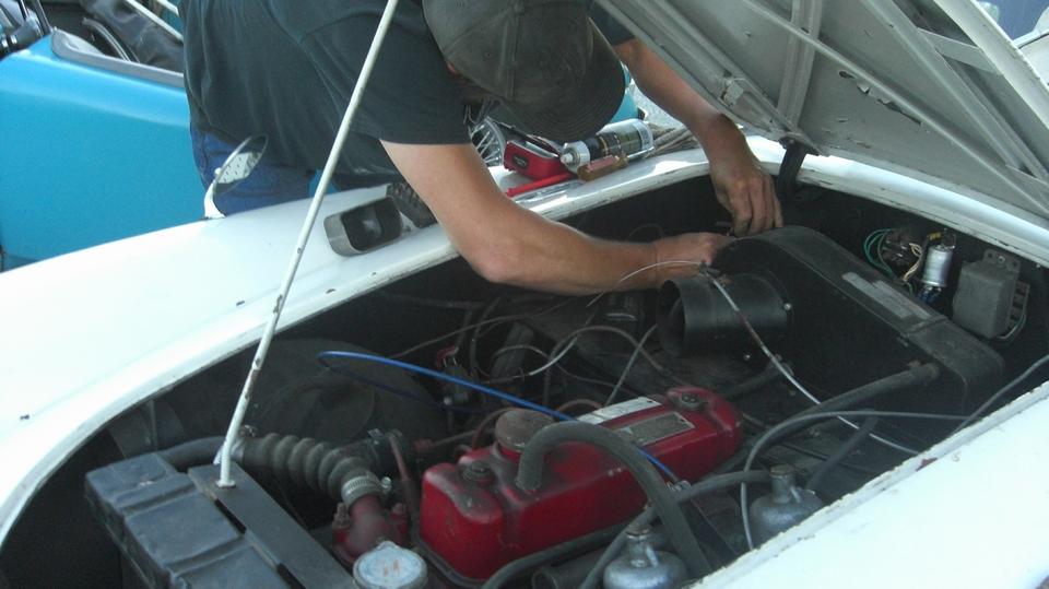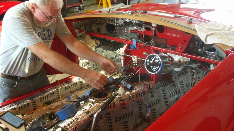 The white MGB has a disconnect between the heater valve and the rotating control knob on the dash. Looks like a cable jacket clamp behind the knob is loose, allowing the cable jacket to move. Tommy's customized MGB is slowly getting the dash wired up, hoping to drive it to the British Car Festival on September 10.