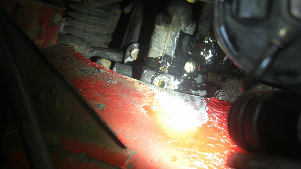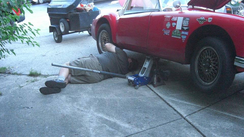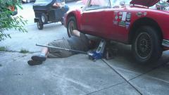 We had a good Wednesday Night Garage Club in Lagrange Highlands, Illinois. The first picture was early with more cars rolling in later, maybe 10 visiting cars with half of them needing some attention. Things were going slow at first, so it seemed like a good time for a little service on our own car, like a few things that navigator could do. We jacked up the right side to grease U-joints in the propshaft and one more on the hand brake cable.