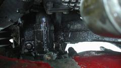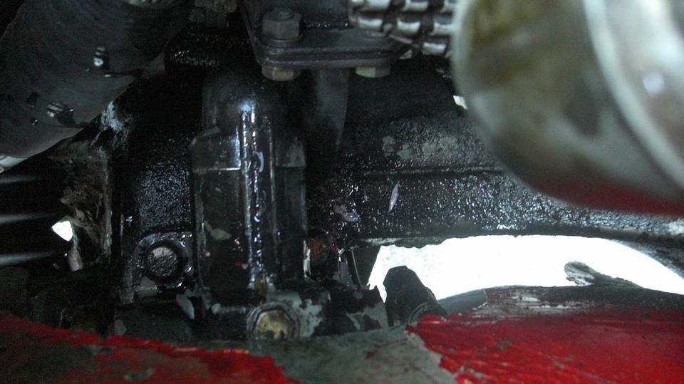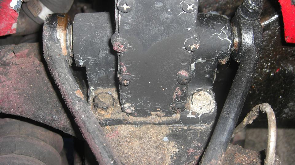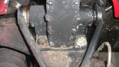 Then jack up the front end to grease the front suspension and steering gear. Reach over the front tires to remove top plugs in the Armstrong lever shock absorbers. Set it down to top up oil in the shocks using a fat soda straw and a small squeeze bottle of the oil. Bounce the suspension to get air out of the shocks, and top them off again before jacking up to reinstall the plugs. In the process, we found loose bolts holding the right front shock on the frame. Good to find that early before any damage. Tighten all the bolts and make a note to check these bolts along with every lube job (at 4000 mile intervals).