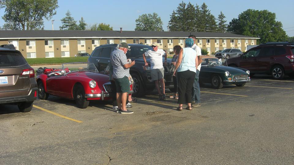 We were sitting a bit too long, and also forgot about the change of time zone. Heading out half past four with 120 miles to drive, we were slowed down in multiple construction zones, finally arriving at the Doubletree Hotel in Grand Rapids, Michigan at 7-pm (later that we had in mind). We were here for John Twists University Motors 50th business anniversary and the MG Summer Party Reunion. Check in, get the room keys, pick up the event registration packet, and head out to the car park for tire kicking session with other MG enthusiasts.