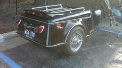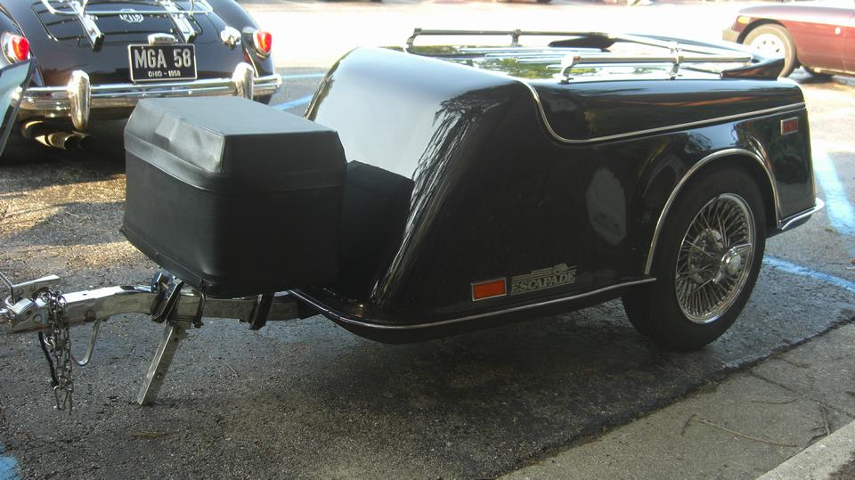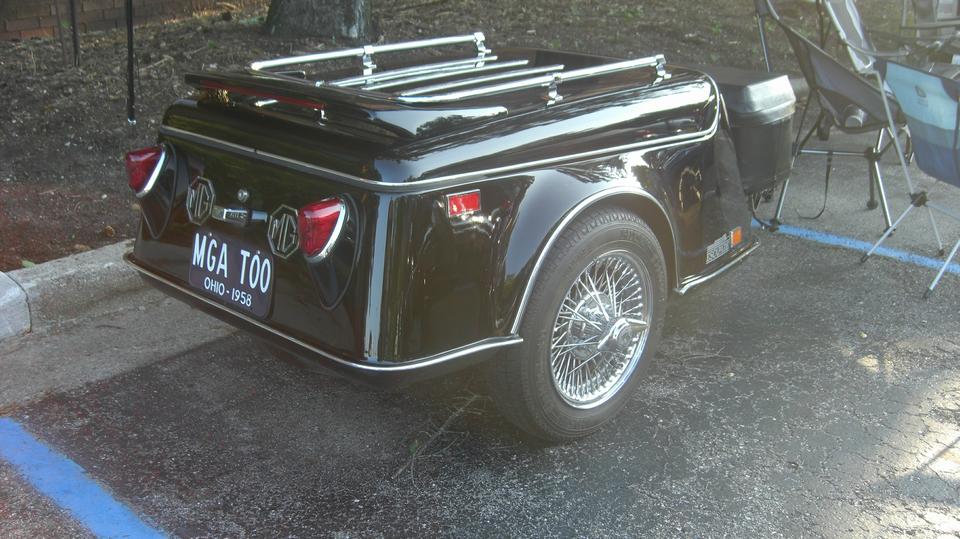 Any small trailer towed by an MG will catch my attention. This on I had seen before at the British Invasion car show in Stowe, Vermont in 2016, and it was already documented on my web site. It is a California Side Car (CSC) Escapade Trailer sporting inverted MGA 1500 rear plinths and tail lights, and optional rear spoiler with LED brake light strip. With the larger cooler in font, the total volume of this one might be as much as in my "Lil Chip" Chipmonk rectangular box trailer.