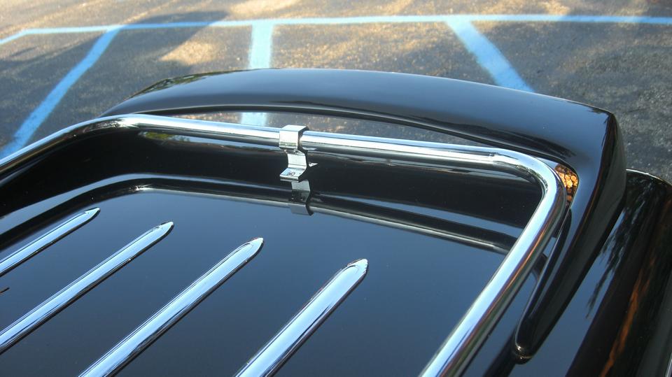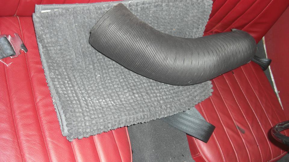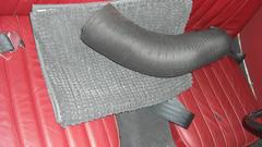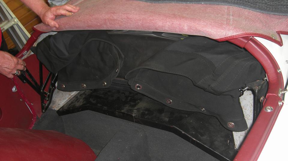 Finally getting the rag top properly folded and stowed (on top of the spare tire). Notice the later model battery cover (with front tab) in black, as received as a new replacement part, still needing the Dzus fasteners. The side curtain stowage bag is in good condition, but the original side curtains need full restoration work. LED tail lights work but are very dim, because wrong type of LED bulb where the light output is directed straight down. The rubber gasket was bad, old, baked, sticking, tearing apart. My inventory list said I had those parts, but a long search did not find any in the Magic Trailer, so make note to order more. The last picture is checking out left corner forward of the radiator where the short 4-inch vent hose wants to be installed. Difficult access there, so the grille needs to be removed before the vent hose can be installed.
