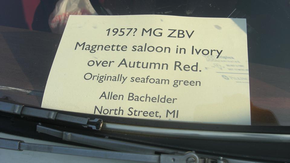 Sit down to rest my feet, grab a snack and a soda, and chat with a few folks who stopped to check out the dirty MGA with all the stickers. There was some sort of gimmick ballot for the MG cars, questions like which car was most likely to pick up a date, which was most likely to win a drag race, long distance award, and who was the youngest navigator. Elliot might have won that one, except he was sleeping and didn't get a hand up.