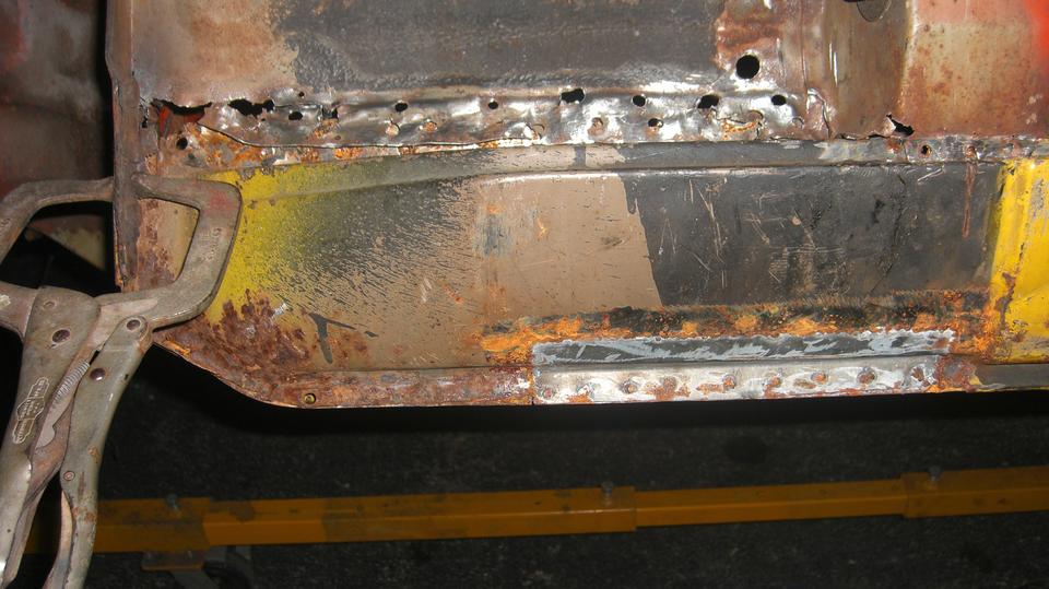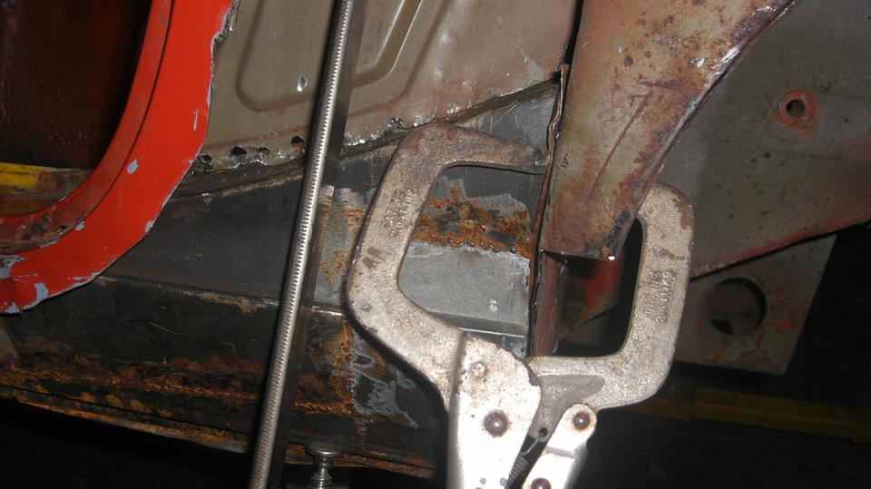 The club project car has been getting some nit picking to remove or beat back a few remaining bits of metal that interfere with fitting the replacement body sill. First time anyone here has ever seen a complete sill assembly from a donor car being transplanted into another car. Lots of trial fitting over the past few weeks, a little cutting, grinding, hammering, more trial fitting, get some clamps, and "Whomp! There it is".