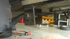 Then get serious about rebuilding the rear sliding mount for the leaf spring curved sliding rear end, on this 375,000 mile trailer. The way this thing works, there is an inverted U-bracket with a cross bolt where the spring end will perch and slide. These days there is s bit more than 1/2-ince space above the spring leaf. When the trailer sits on the ground, that space is below the spring, above the cross bolt. There used to be a horizontal plate welded in there just above the spring leaf to minimize the free space and vertical motion. But those steel plates must have been fairly thin, because they have long since worn away, gone. As a matter of expediency, we decided to go old time and install a wooden bearing plate above the spring on each side. Soon finished, sorry I didn't get the picture, maybe later. Sixteen jam nuts on the U-bolts got the axle reinstalled, wheels on and trailer back on the floor.