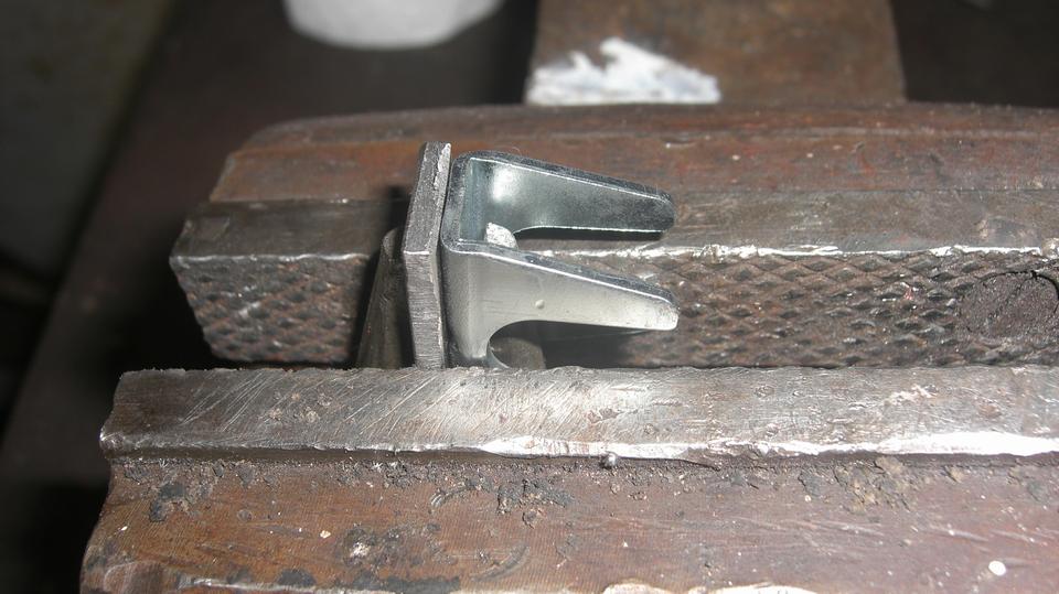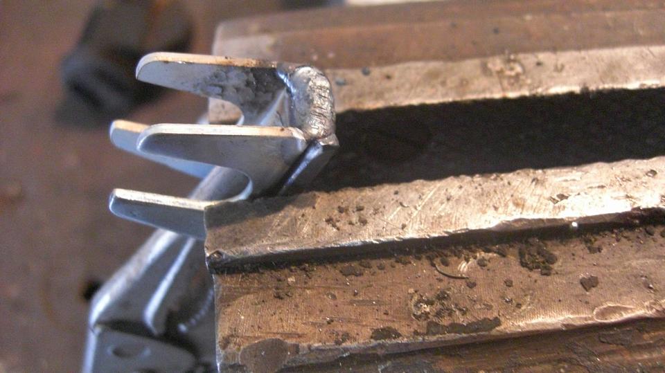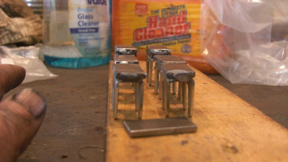 Clamp the shim plate to back of the adjuster mask, mount it in the vice, tack weld one end. Then turn it around to tack weld the other end. Rinse and repeat 6x. Grind the back plates flat, and touch off the ends. File away or grind out any weld that happened to obstruct the inside corners, so the adjuster can seat properly at zero. Finish by adding a second layer shim to two of the masks that will be used for the rear brakes.