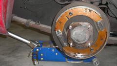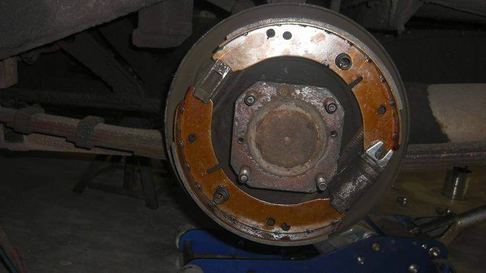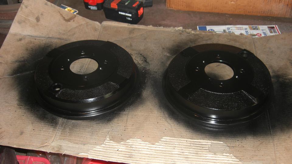 Jack up the rear end to remove wheels and brake drums to swap in the new double shim adjuster masks. While I was doing that, brother was cleaning the new drums with lacquer thinner and let dry, and navigator was spraying them with some heat resistant black paint. That would be a good rime for a late lunch break while paint was drying.