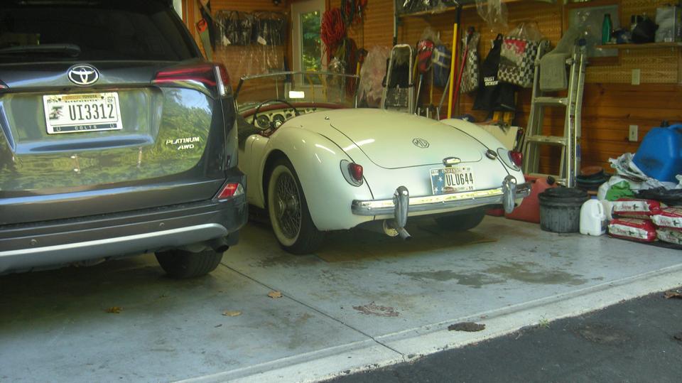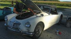 One hour cruise after breakfast brought us to visit John and Jane Mobley in Martinsville, Indiana. this is a 1956 MGA older restoration with some loose parts, definitely a driving car, just needing some refinement. Making a list of minor items for future attention, like the muffler wanting reorientation,