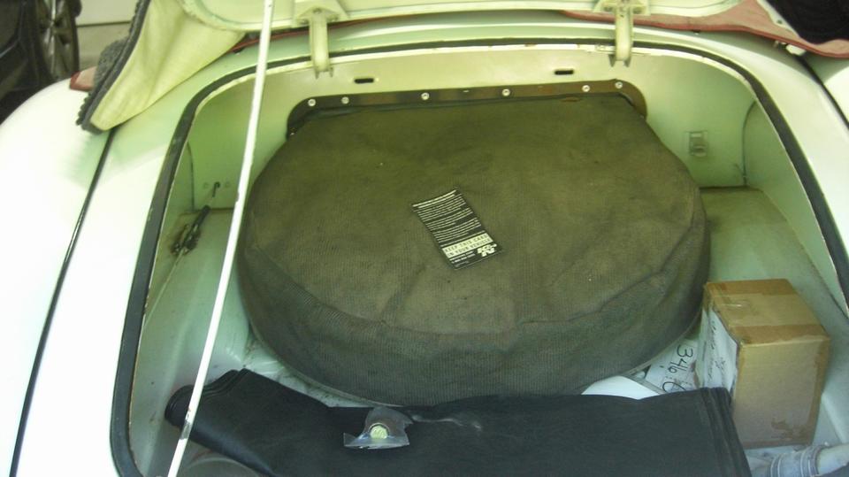 and a missing P-clip to secure the air vent hose to inner wing, one short vent hose needing to be installed forward of the carburetors. Checking stowage of the convertible top and side curtains, we pushed the spare tire forward top be nested properly, noting missing tire hold down clamp and the securing fastener parts. Nice original Hondura tire cover needing to be cleaned. That was secured with screws rather than original rivets, so had apparently been moved during prior repaint. No tools or tool bag or securing straps, no screw jack or jack handle, and no hand crank. The tonneau cover was an aftermarket installation with snaps rather than LTD fasteners.