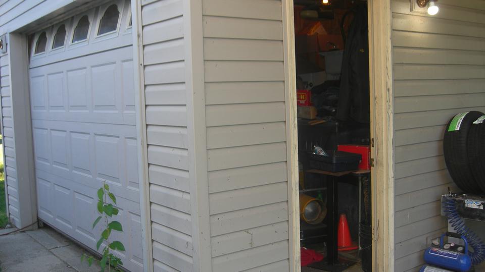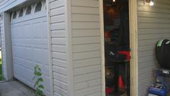 Things look different by the light of day. This neat house has been turned into a screen printing shop where Shane does the graphic printing on T-shirts (among other things), not much space left for people. We will be hanging out in the motor home for a while. Taking a brief peek into the garage, nothing to write home about, well stuffed with "stuff", mostly not car related.