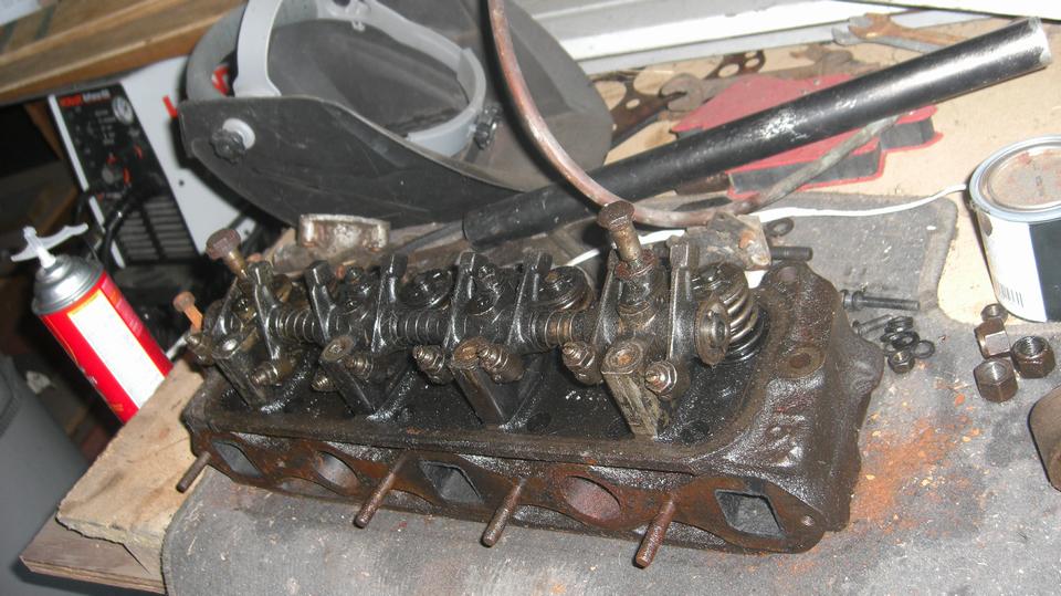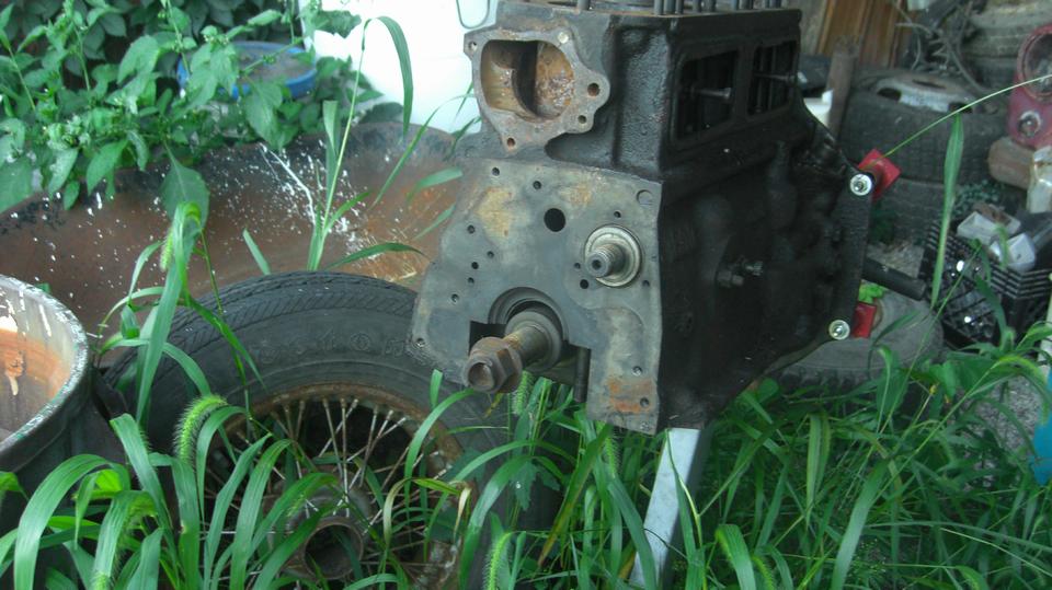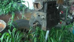 Heading for another shed to the left, we tripped over the short block that used to be matched with the cylinder head above. Pistons seized, they were trying to beat them out from the bottom when they chipped a piece off of the bock, taking out a chunk of bottom end of a cylinder wall. Being a 1500 block it may just become a boat anchor.
