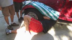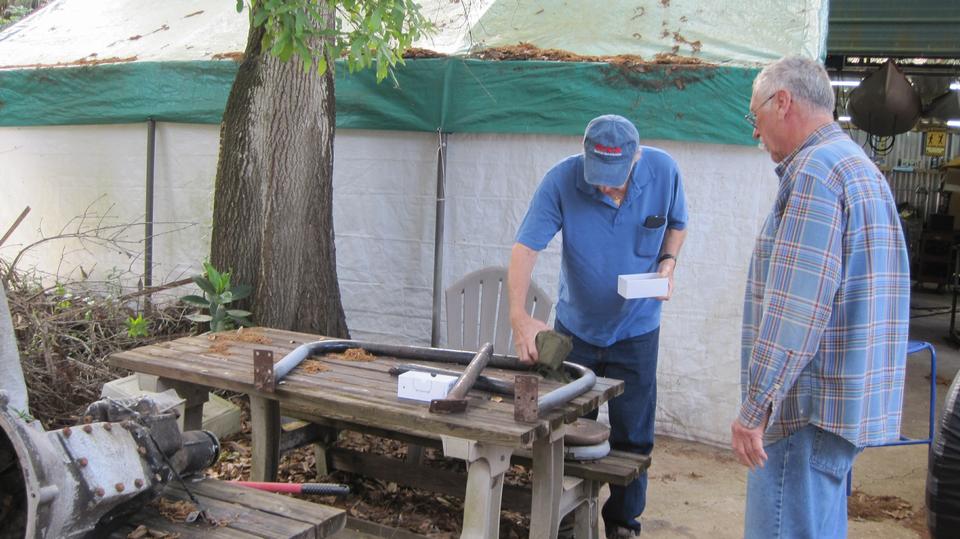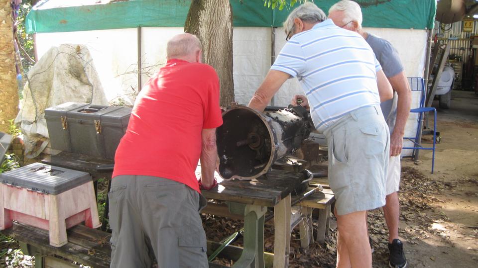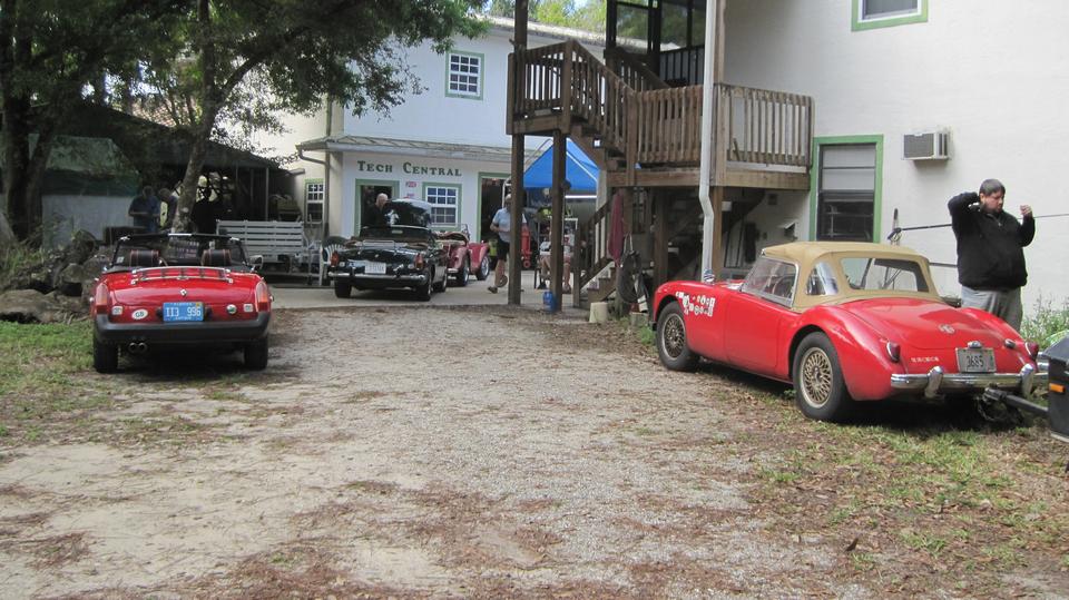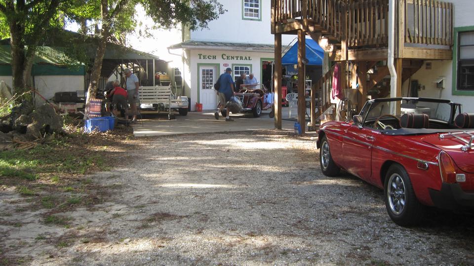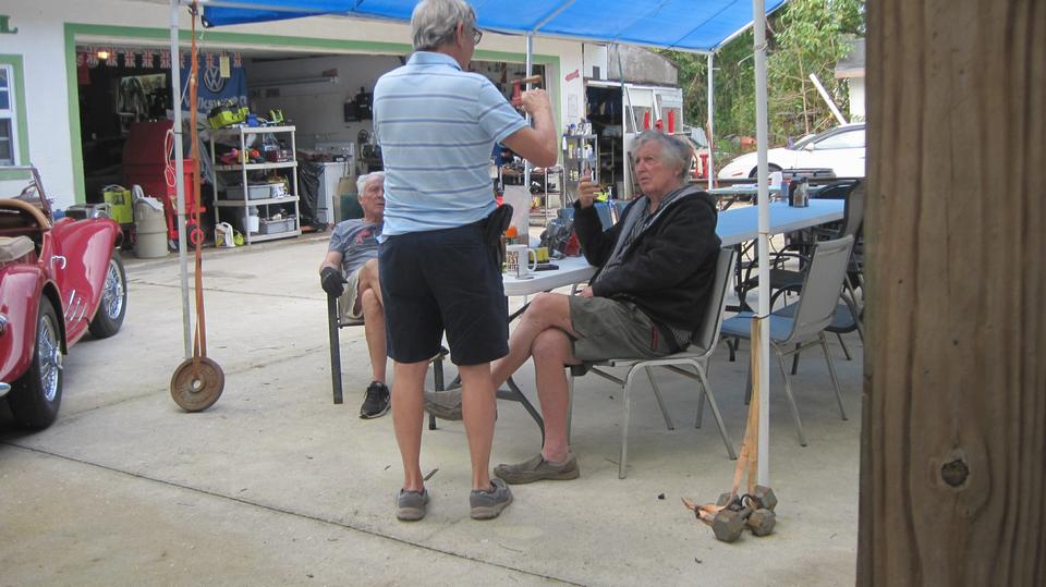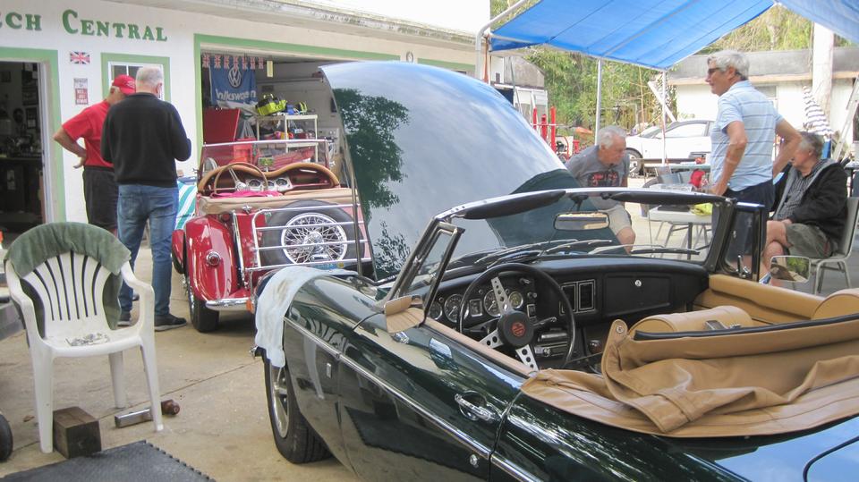 Tinkering day at Tech Central in Bonita Springs, FL. There are a few things on our to-do list for the MGA, not so urgent, so likely can wait a little longer. Bit of a parking problem (not all bad), so we put the MGA in the grass near the house. Just as well, as we would be running to the trailer for parts and tools a few times. I thought the guys were working on the roll bar, but not so. They were trying to salvage an MGB 4-synchro gearbox that looked like it had been in some water, kind of corroded with frozen shifter parts. They had it soaking in kerosene for a while, then fighting with the shifter parts, and finally got it shifting through all the gears before lunch break.