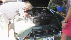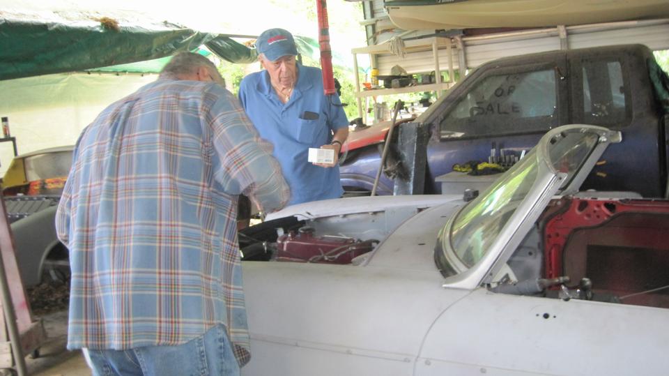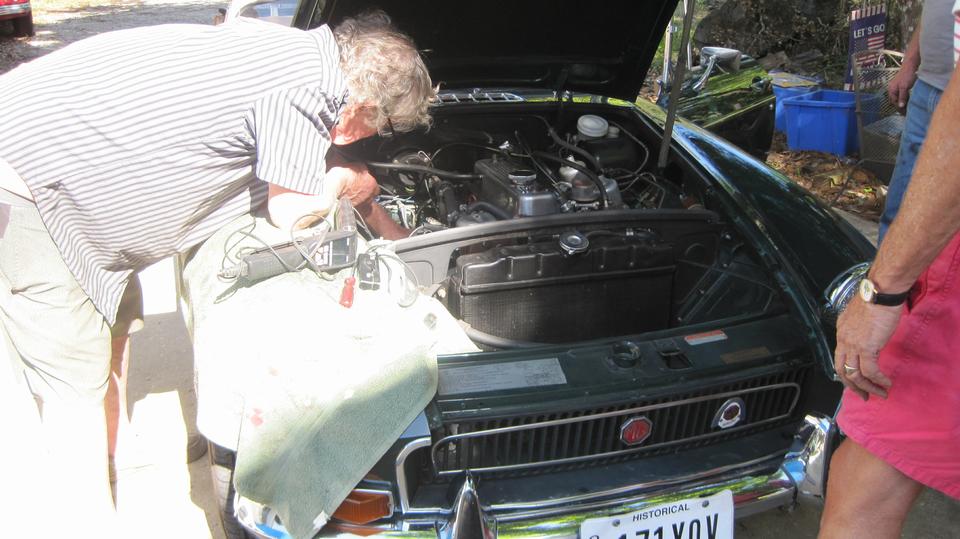 Bit of a tech discussion with the guy in the stripe shirt asking questions about front suspension swivel links for an early MGA. We would get heavy into that later. The MG TD had questions about adjusting door latch strikers to make the doors close and latch tighter. The MGB had some bad running problem that was intermittent, but fouling #3 and #4 spark plugs badly. We would get into that one more later too. Meanwhile, go retrieve our new door hinges that had been hanging out to dry for a week. Being Rustoleum, the paint was dry but still soft after a week in the breeze. Set those aside until we can find time to install them.