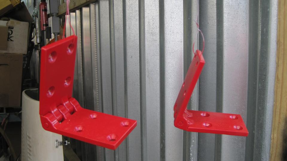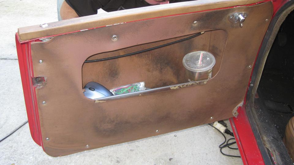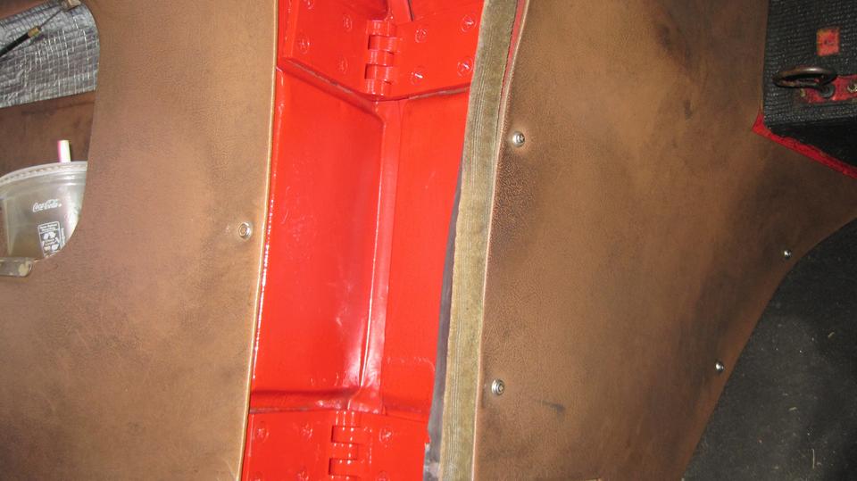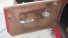 The rest was old school, using all new screws this time. Assemble the new hinges with no shims, align the door height, and tighten the screws. Of course the door didn't quite reach the striker plate. Tape a piece of thin steel wire to a 3/8-inch drill bit, and dangle the drill bit inside the hinge very neat to the hinge pin. Closing the door and giving it a little push bends the hinge leafs apart, making the hinge thicker, which moves the door rear ward. Five minutes fiddling to expand both hinges just enough to align the latch,and the door will close and latch with one finger push. Neat,huh? Spritz a little paint over the screws, and reinstall the door pocket and panel. -- The last picture was Jerry putting the last bits of edge trim on his rebuilt trailer door. But mostly he was very happy to have gotten the racing Rabbit engine back together and running again after yesterday's camshaft mishap.