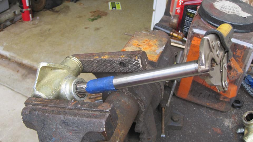 Then grab the 3/4-inch reamer out of the Magic Trailer, and get to work with the bench vice and Vice-Grip and pry bar to manually ream the first bushing to finish size. That's a trick I learned back in the mid 90's to avoid a time consuming trip to a machine shop, and it has served me well, but it is a lot of work. Then it dawned on me that Tech Central has a drill press that I had forgotten about. So it was way much easier to ream out the other three bushings. Send that guy on his way with a big happy grin on his face.