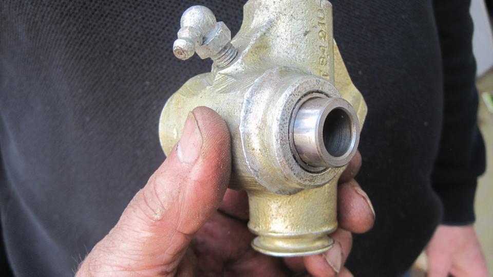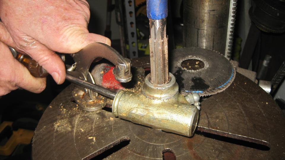 My first project for the day was a set of front suspension trunnions for a 1957 MGA. The owner doing restoration work had pressed the bushings in with incorrect orientation, with the side relief notch facing the grease fitting rather than facing the swivel pin. He had also pressed the bearing tubes into the bushings without reaming the bushings, so everything was solid tight, could not move. So first business was to use the 20-ton hydraulic press to remove the bearing tubes, and remove the bushings, and reinstall the bushings in correct orientation.