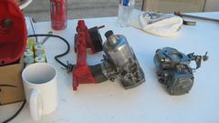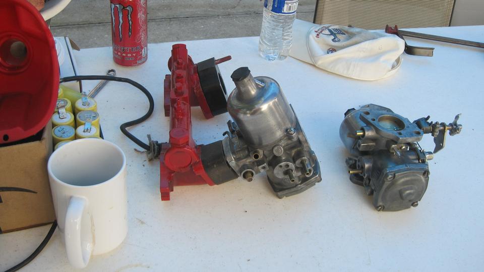The next picture is Jerry working on camshaft installation and timing on the Rabbit race car, just finishing up. So careful to get everything just right, but he forgot to remove the wrench from the crankshaft nut. When trying first start of the engine, the wrench hit some obstacle, the nut unscrewed itself, the timing sprocket fell off the crankshaft, and it lost all of the cam timing setup. Bummer. Just step back, walk away from it, and take it up again tomorrow. -- Then a set of SU HIF-4 carburetors freshly rebuilt and in process of reassembly. Finally we were back to the bad running green MGB. Fouled out spark plugs, so they installed a new set of plugs. #3 and #4 plugs quickly fouled out again to the point where it wasn't firing on #3 at all, just while it was sitting there trying to get tuned up. Conclusion is rear carburetor had a severe fuel bypass leak with the cold start enrichment circuit, so these carbs were going to need a fresh gasket set. Chore for another day, so get it back together enough that it could be driven home.