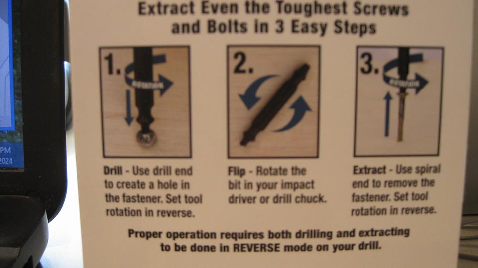 Side trip to Harbor Freight to pick up two sets of Screw Extractors. When you bugger up the screw driver slots in the screw head, and you can't get it out, this can be the solution. The drill end of this tool looks like a center drill. The pilot end is small diameter and short with a left handed drill tip. This is followed by a counter sink shape cutter, also with left handed drill point cutter. Turn it backward (counter-clockwise) in a power drill. About the time the countersink cutter gets through the screw head, the screw may (if you're lucky) just unscrew. Or the other end the tool works like an easy-out. Tap the tapered burr into the drilled hole, and unscrew the damaged screw. These bits are high strength impact rated, so a powered impact driver is recommended to do the trick.