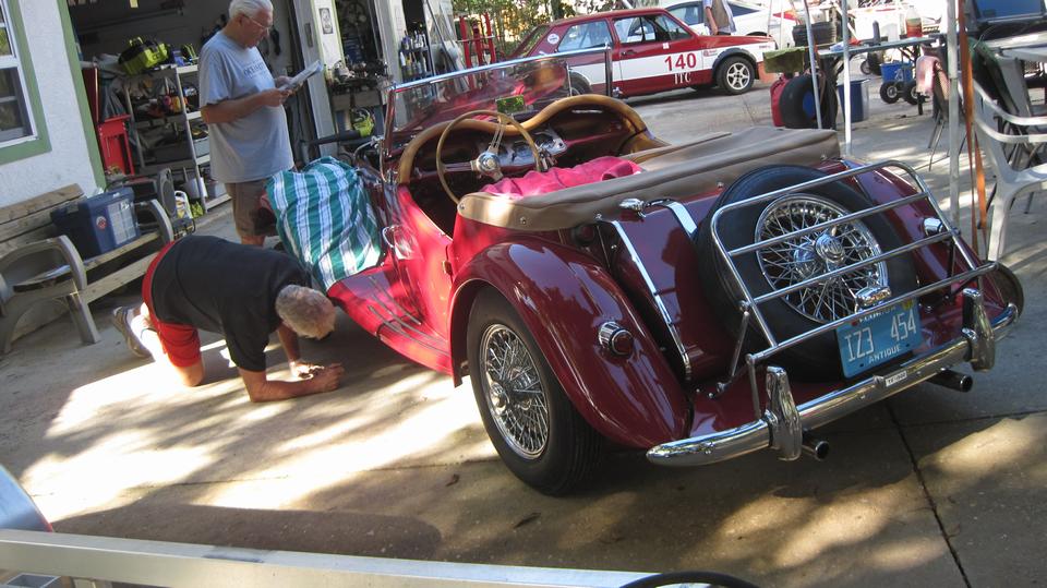Chat about getting vintage racing tech inspectors convinced that 15" x 4-1/2" wide 60-spoke wire wheels were a factory option for the MGA. Boy those guys are sticklers for originality.