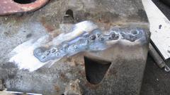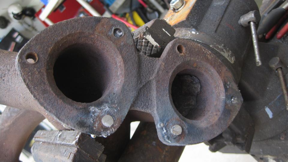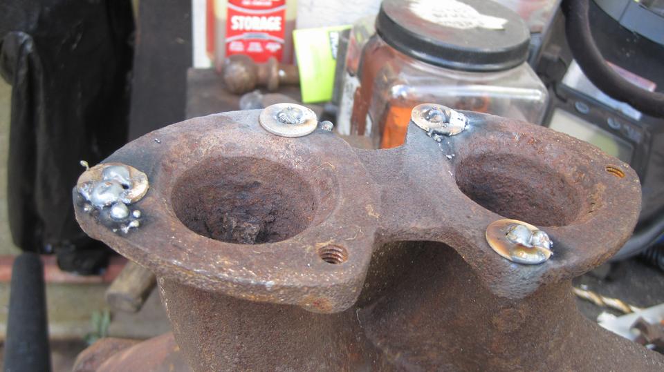 Time to salvage another MGB exhaust manifold with broken bottom studs. We do a couple of these each year, usually heat the iron and unscrew the studs with a Vice-Grip. But these studs were all broken near or below flush. The idea hear is to plug weld a steel washer over the end of the stud, grind it flat, weld a hex nut onto the washer, and then unscrew it with a wrench. No such luck this time, as the plug welded washers kept breaking loose from the studs (bad welds I suppose).
