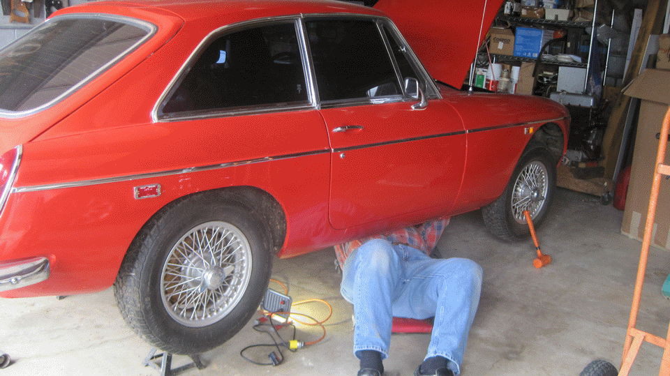 Good morning garage at Larry Peck's place in rural Blaine, Tennessee. There was his MGB GT with a non-functioning clutch after conversion to a Datsun 280Z 5-speed gearbox, with all of the Datsun clutch parts. He had been spending too many days attempting to bleed the clutch slave cylinder with not much luck, clutch still not working.