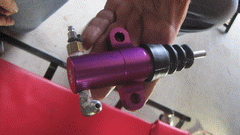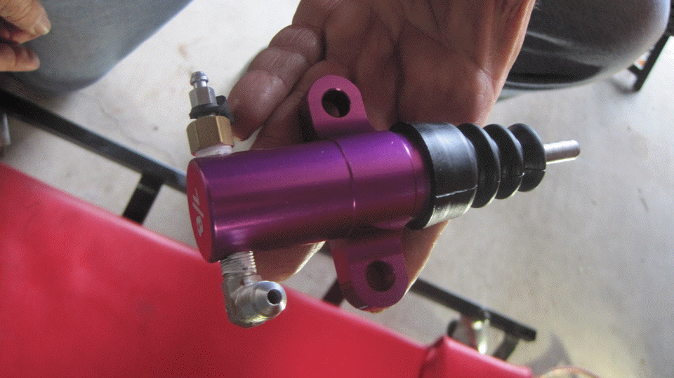 He had another new slave cylinder, but it didn't fit the bolt pattern on the bellhousing, as the first slave had been slotted inward to fit bolts with closer hole spacing. The expedient solution was to move the working parts of the new cylinder into the old cylinder body. In retrospect, maybe even that was not necessary, as we then discovered it was still impossible to bleed the air or fluid.