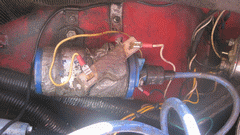 Mityvac didn't work, as it appeared to be drawing in air around the bleed screw threads, and no fluid was drawn through. The normally bullet proof method of pumping pedal with finger over the bleed nipple to serve as a check valve was also not working, as no air at all was being expelled with each stroke of the pedal. The problem was, the new clutch master cylinder was not moving any fluid at all on the first stroke. And the chore of R&R of the clutch master cylinder for bench bleeding was more than daunting. So we decided to pressure bleed it, with whatever tools were at hand (failure is not an option).