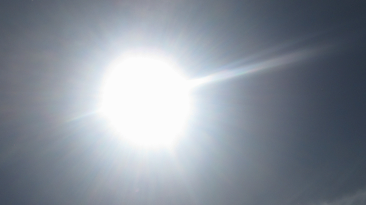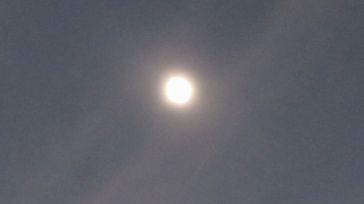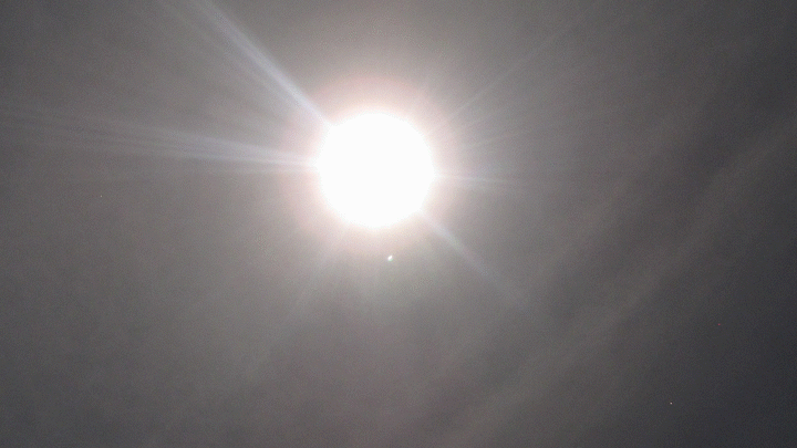 Next picture 1:58 below is the only one to appear with the dark moon and bright contrasting corona around it. I believe that is the last picture with enough light to make a brisk click with no noticeable time delay. The next couple of pictures had a notable shutter delay for a short time exposure of about half a second. I suspect the second 1:58 picture with brighter face and little corona showing is as close to full eclipse as can be, with the apparent bright face being due to earth light being reflected back from the face of the moon. Sorry, no fancy instruments, so no center exclusion disc was available. I had more pictures in between, but left out some that looked like near duplicates with not much change. In the 2:00 picture, the brighter background implies longer automatic time exposure, which could also mean the brighter face could still be increased earth shine reflection.