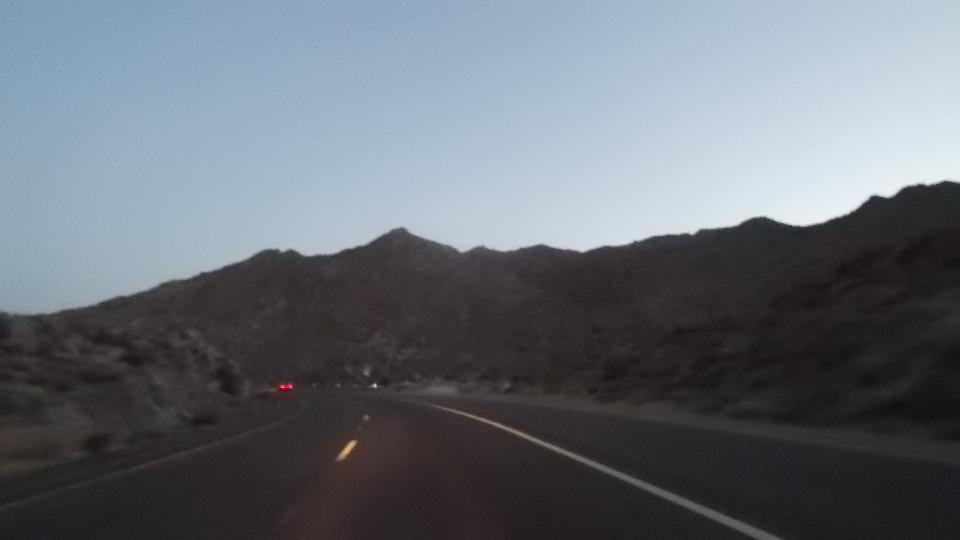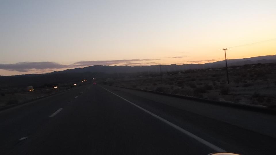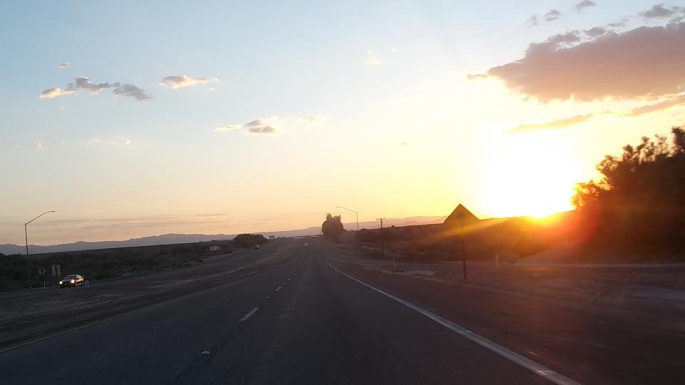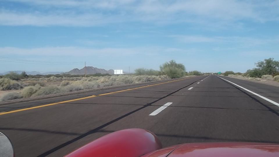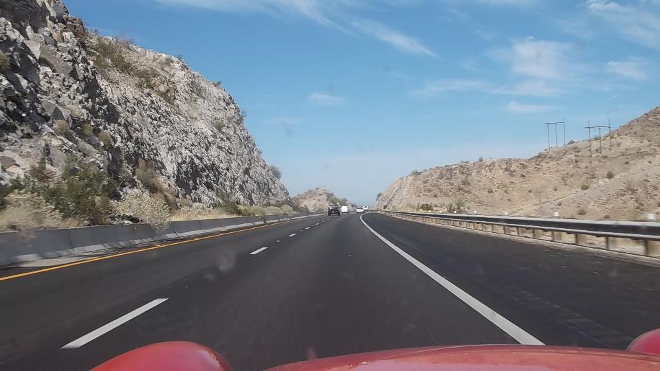 Travel day, and it's still hot in southwest Arizona. We tried top down for a while and got baked, making us wonder what we were doing down here. It was nice to hit the Fortuna Foothills and see something other than flat and straight (for a few minutes). Then we pulled into Yuma for a cooler and more WiFi, forgetting about hitting the Pacific before sundown. Early evening, still hot, top up please, one mile on welcome to California (finally).