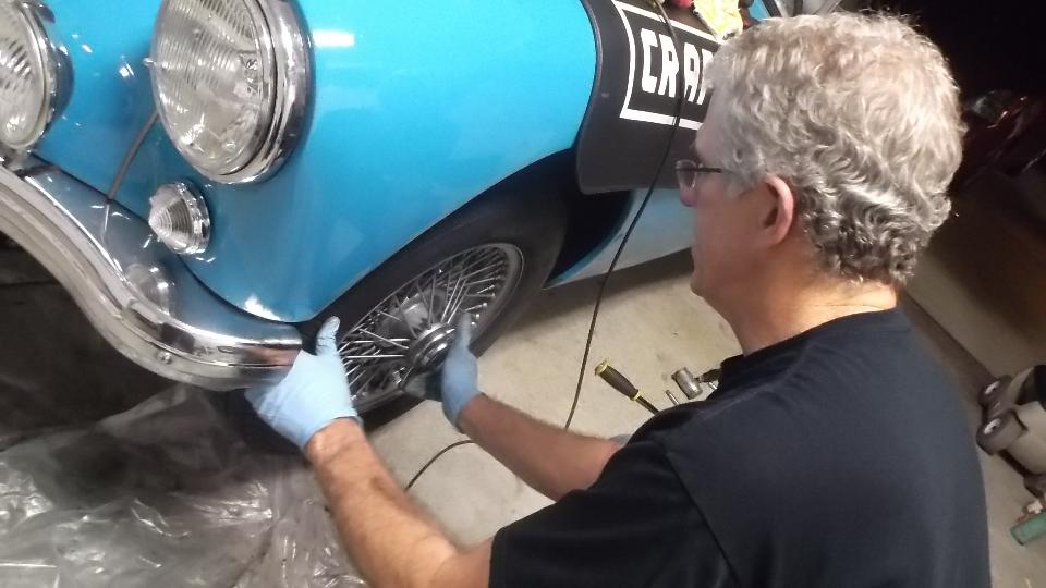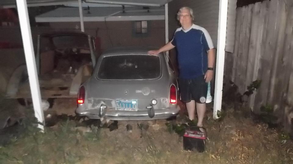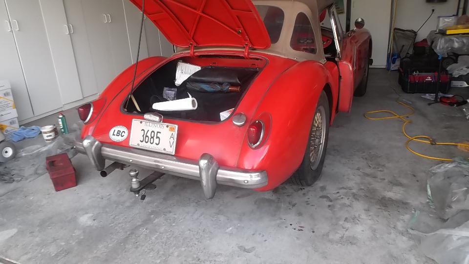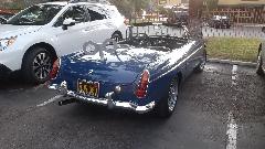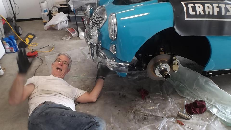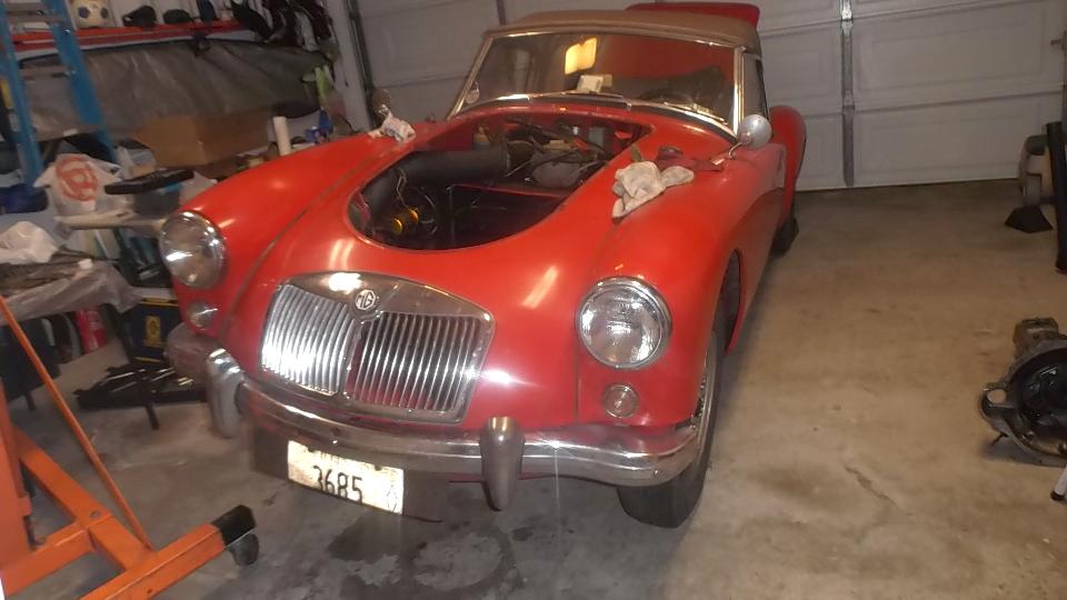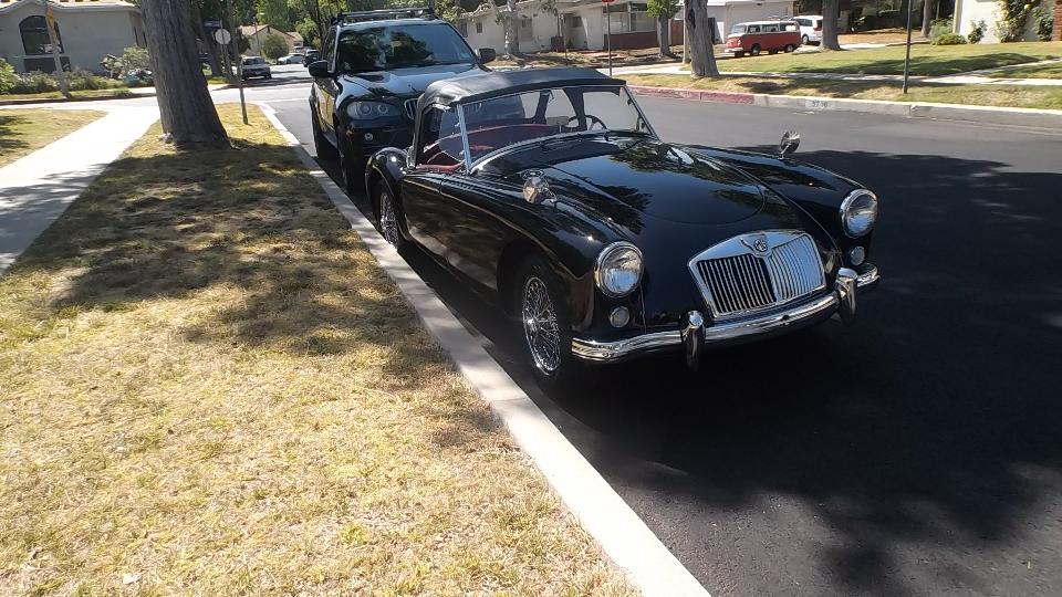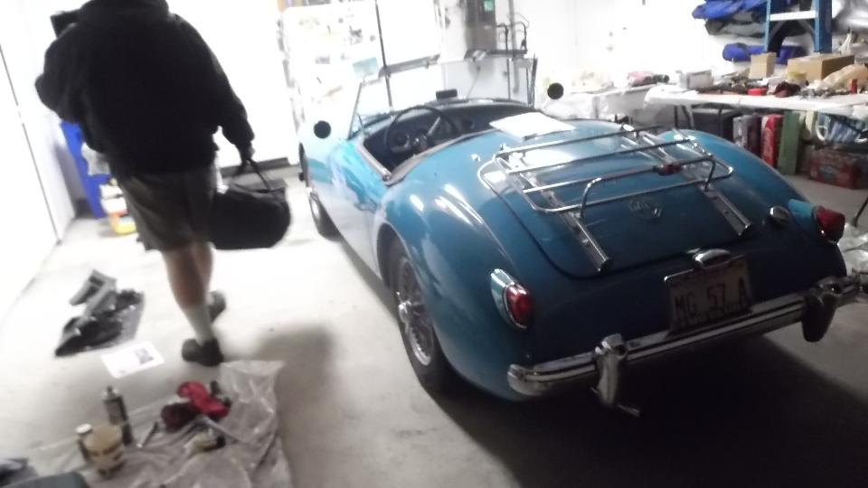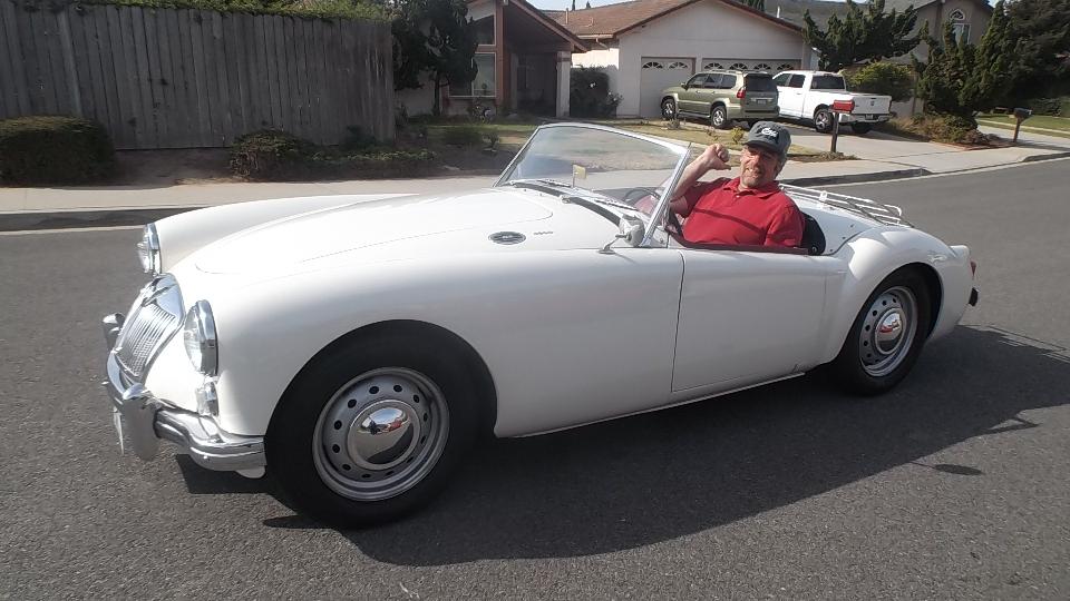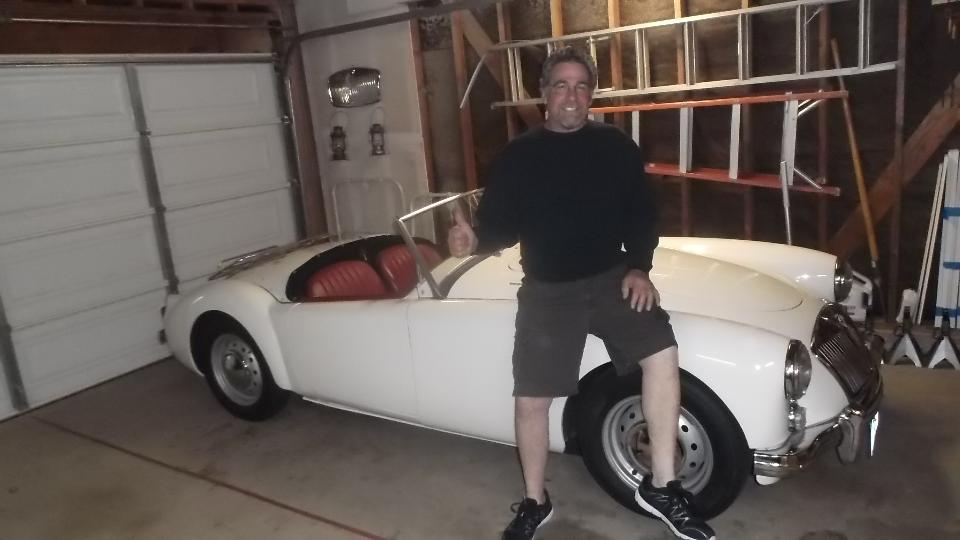 Meet Rob Zucca, curator of the Regan Library. His MGA 1600 was "restored" before he bought it, but required a certain amount of TLC for some adjustments. Today it started too easy from cold, likely running too rich, verified by the "rich spot" (smudge on the garage door), so I had something useful to do here.