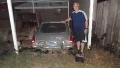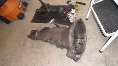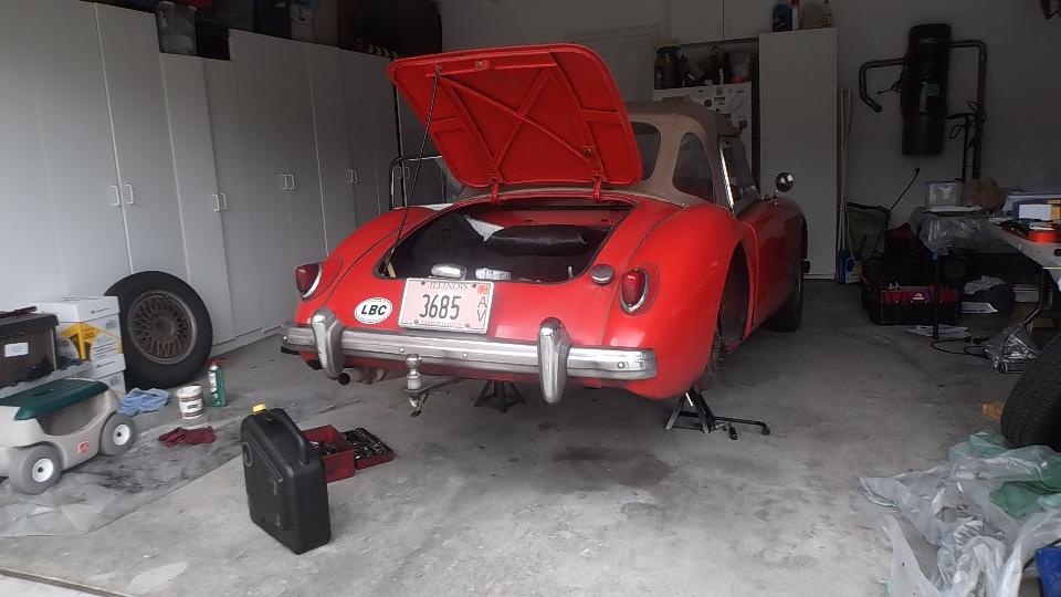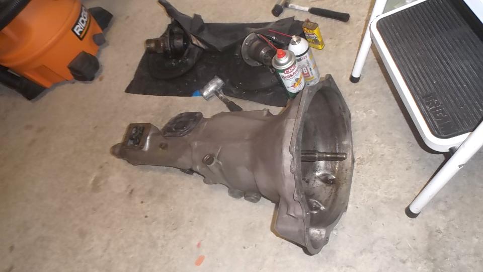 I spent some time with a thin screwdriver and rag and solvent cleaning the rear of the tail housing and spline in preparation for installing the new bushing (whenever it may arrive). Put the drain plug back in the gearbox. Jack the car two stage down removing the stands. Push the beast outside, and push Scott's MGA back inside. Now we have two disabled MGA in the same place, but will see what we can do about that.