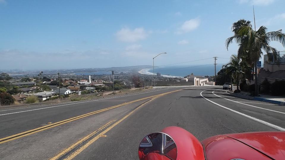 Still flat for a while until we passed El Centro and got into the foothills again before Campo. With sundown an higher altitude we finally had some relief from the heat, and the coolant temperature finally dropped from 230 to 210. Then it was happy lugging the hills in 4th and sometimes 3rd gear getting cooler all the way. We stopped just long enough to Hit Subway for a couple of Foot-Longs. Passing through Campo we had hills and turns continuously, quite delightful. Almost close enough to smell the ocean we bailed off of CA-94 onto Otay Lakes Road, then followed Olympic Parkway and Orange Avenue into Chula Vista. Then a couple exits down I-805 to Palm Avenue, and west to Imperial Beach on the coast.